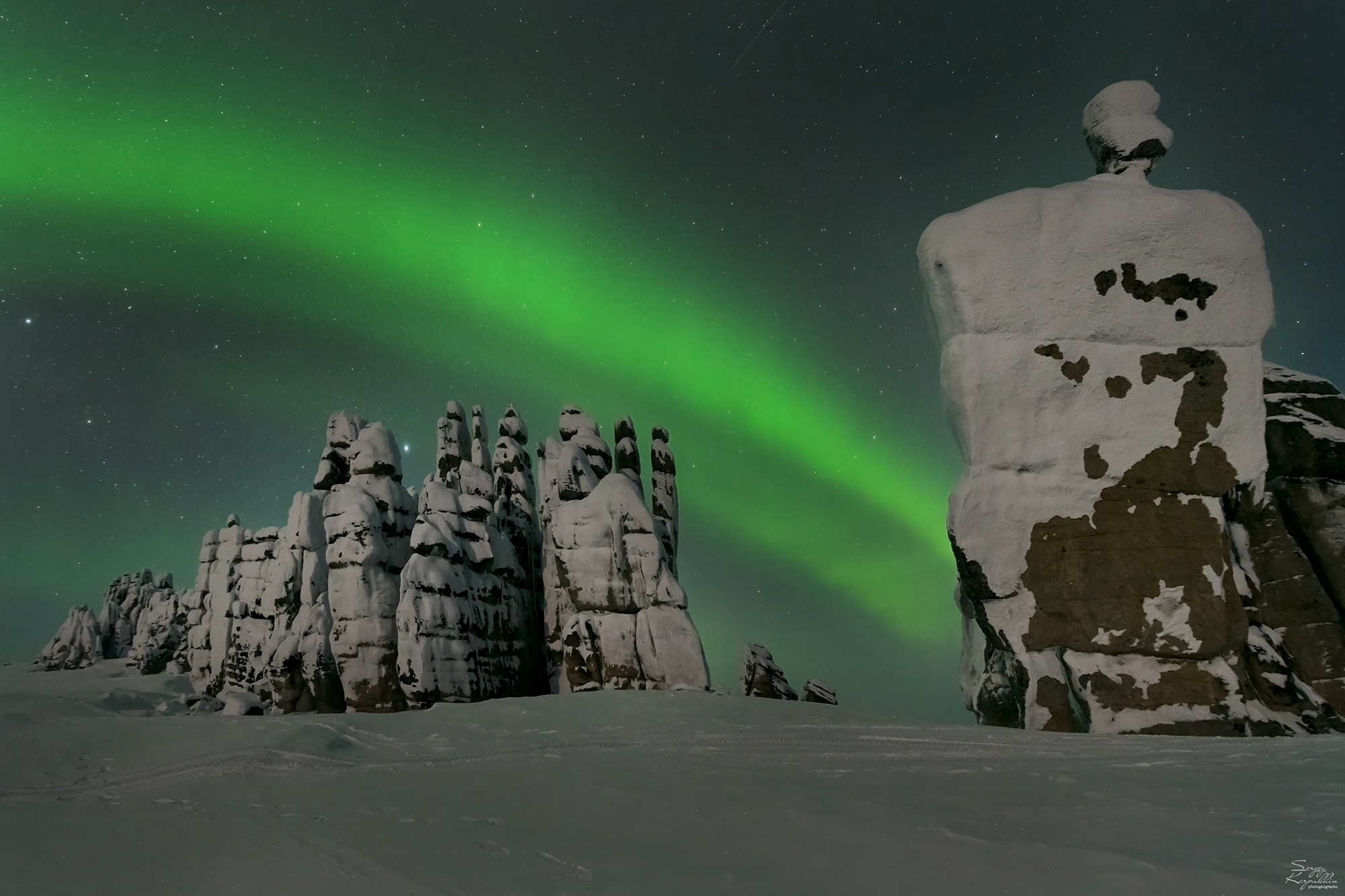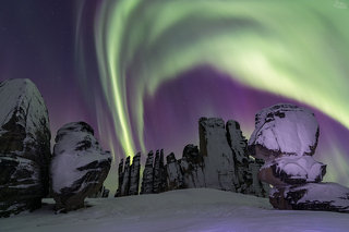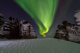 Зима здесь фотографически гораздо более интересное время, чем лето. Кроме того, в это время нет комаров и не нужно тащить на себе рюкзаки. А снять вот эту удивительную архитектуру в сочетании с северным сиянием. Это же круто! Да и сами останцы в куржаке, да ещё в режимном свете, выглядят весьма эффектно. Ну и как дополнительный бонус, вы сможете познакомиться с бытом местных жителей и настоящих промысловых охотников, а также послушать их истории о том, как они добывают бивень мамонта и в летнее и в зимнее время.