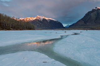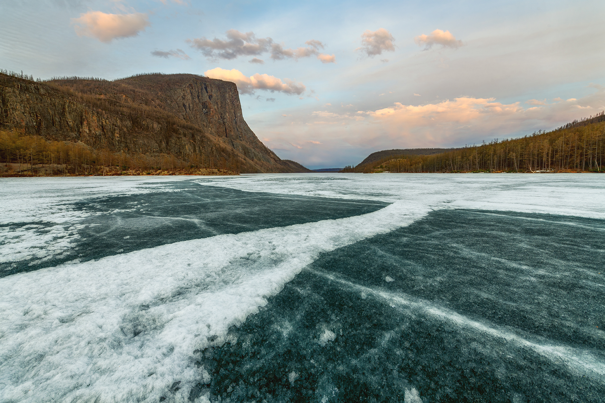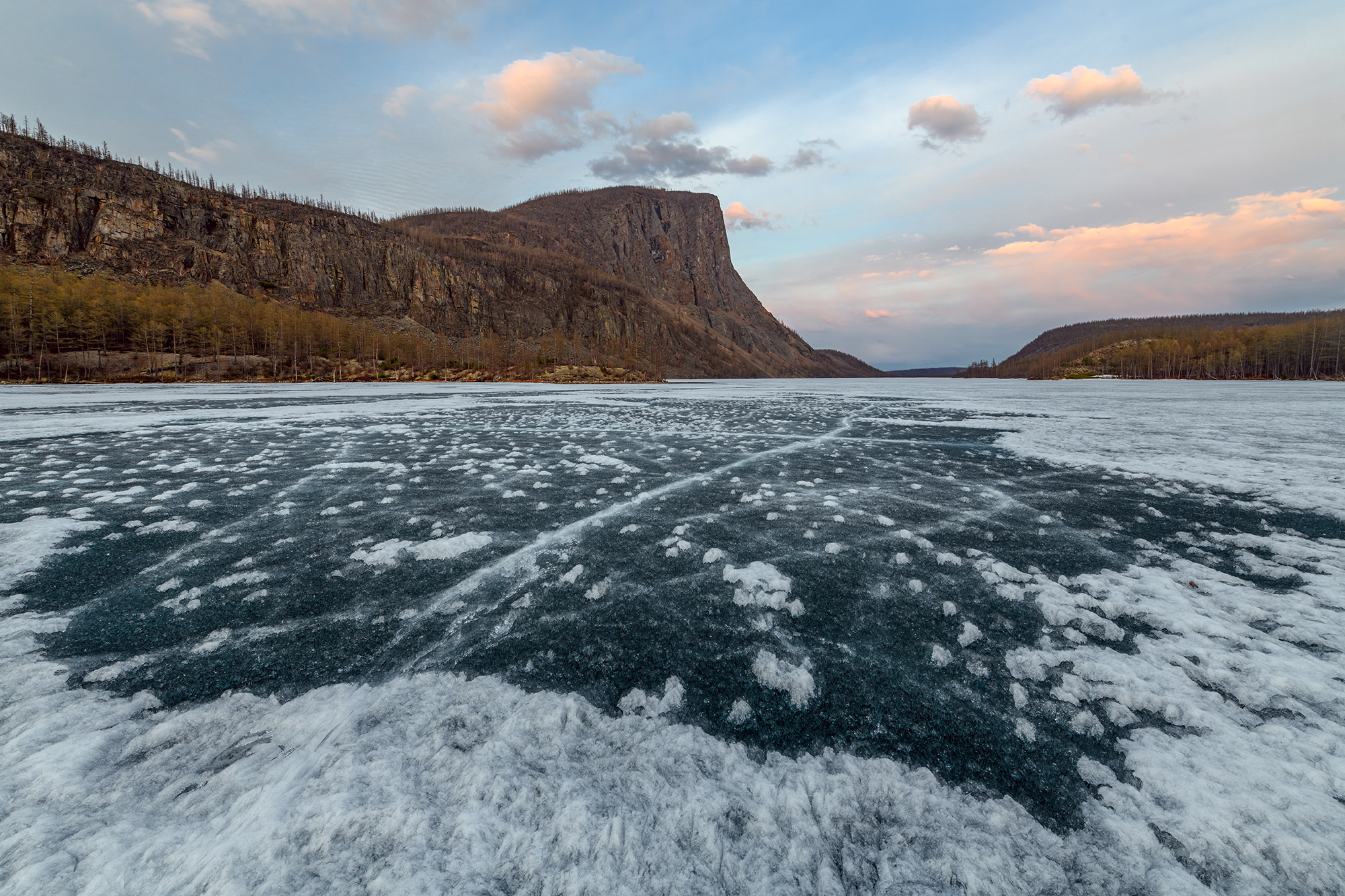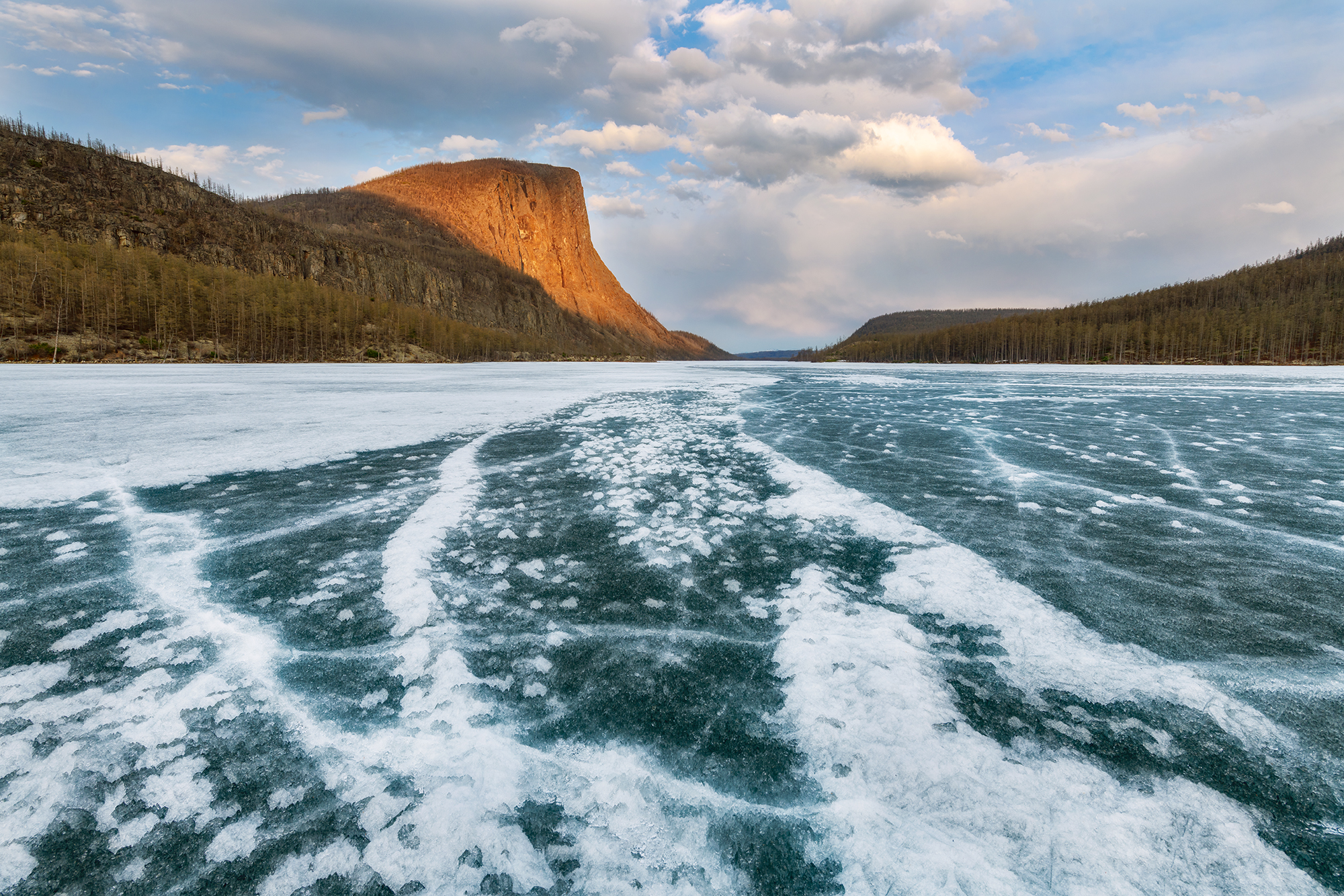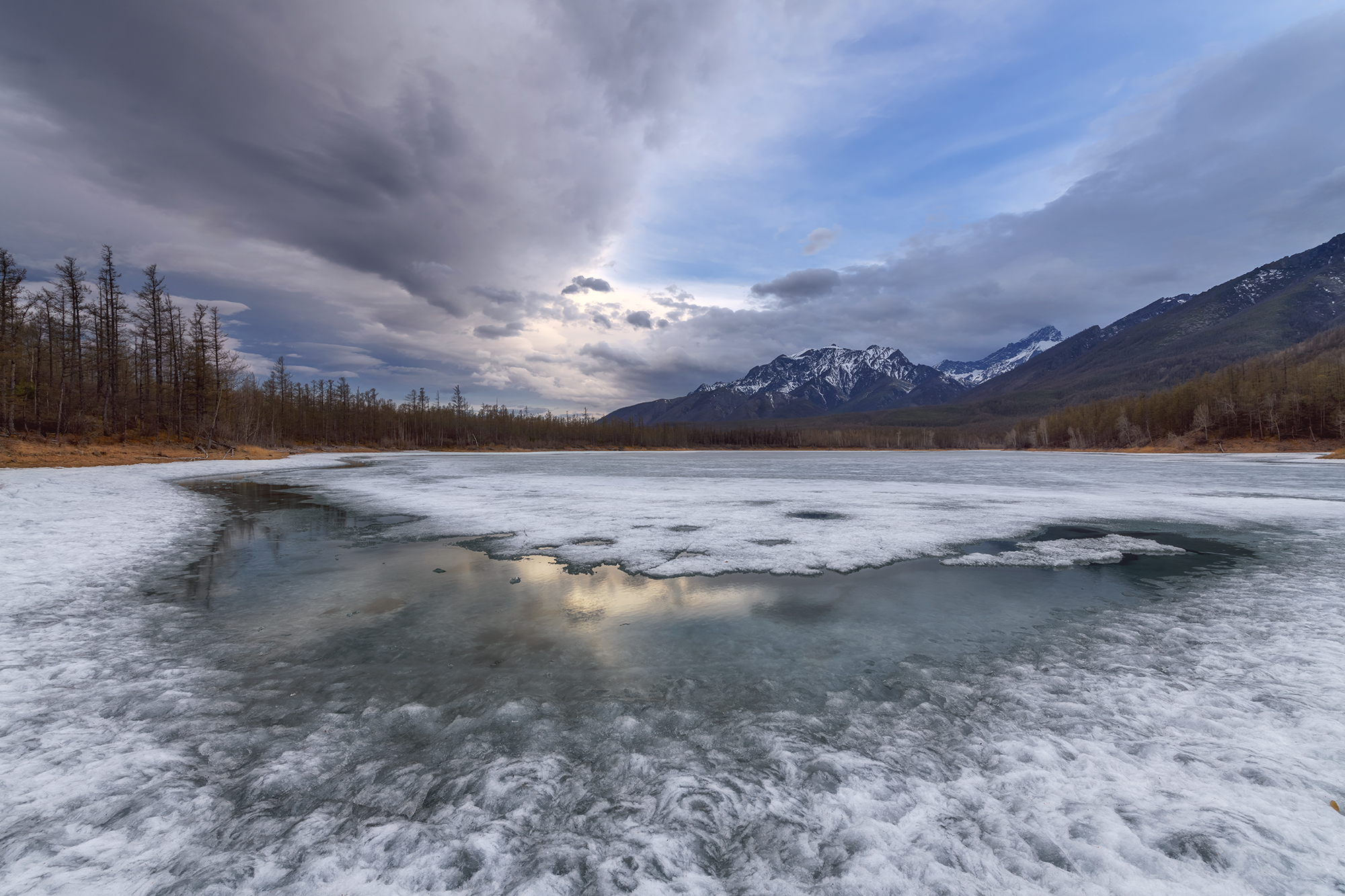 Вторая локация — озеро Зарод. Туда мы также переедем на вездеходе-болотоходе. Над озером возвышается каменная громада одноимённой горы, с плоской вершиной. Она будто островом тут встаёт и отделена от всех остальных гор. В это время озеро ещё покрыто льдом, хотя забереги уже есть. И вот это и есть основное преимущество локации в это время, для пейзажной фотографии. Поблизости множество и других, более мелких озёр. Есть где погулять и что поснимать.