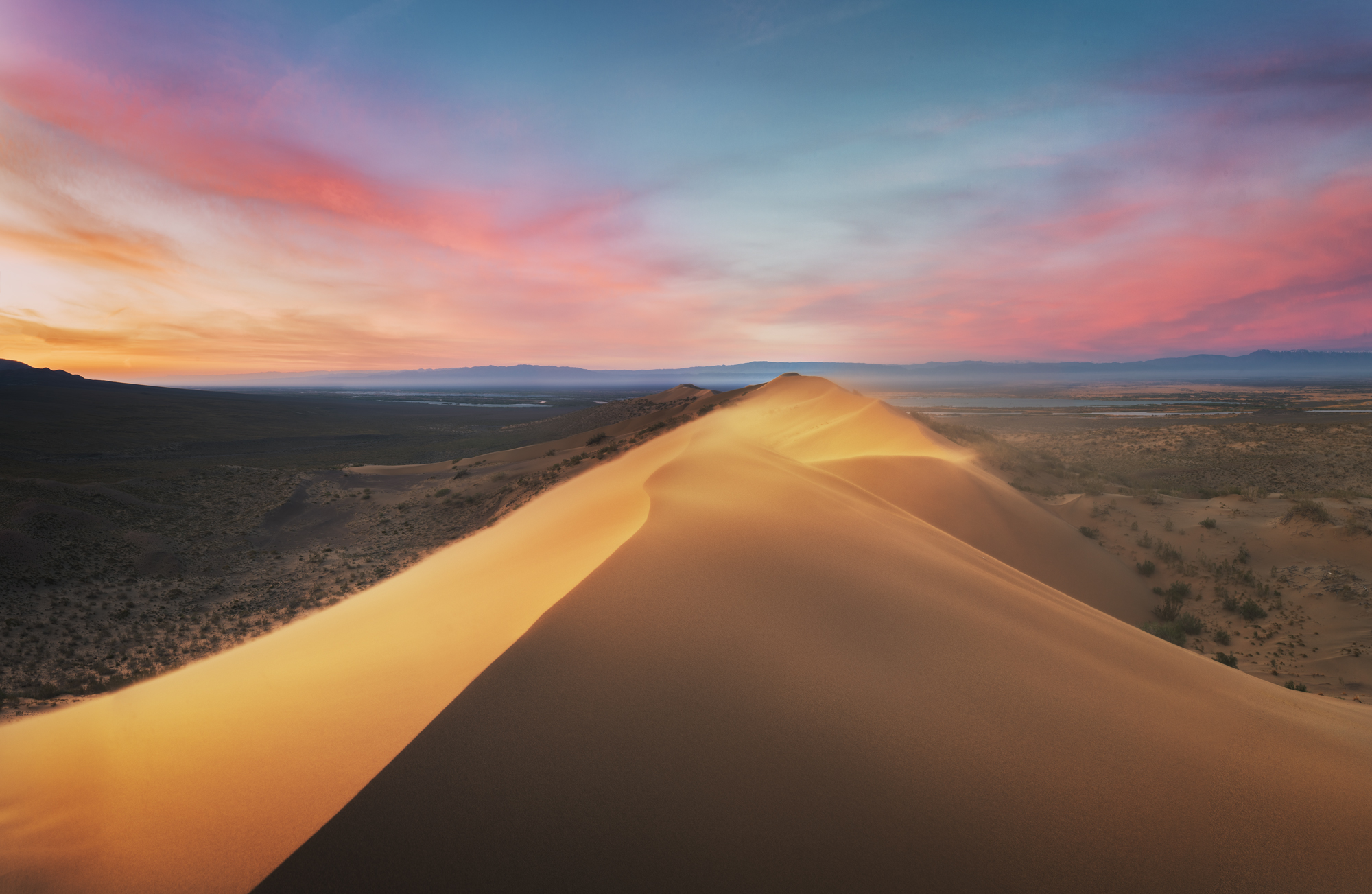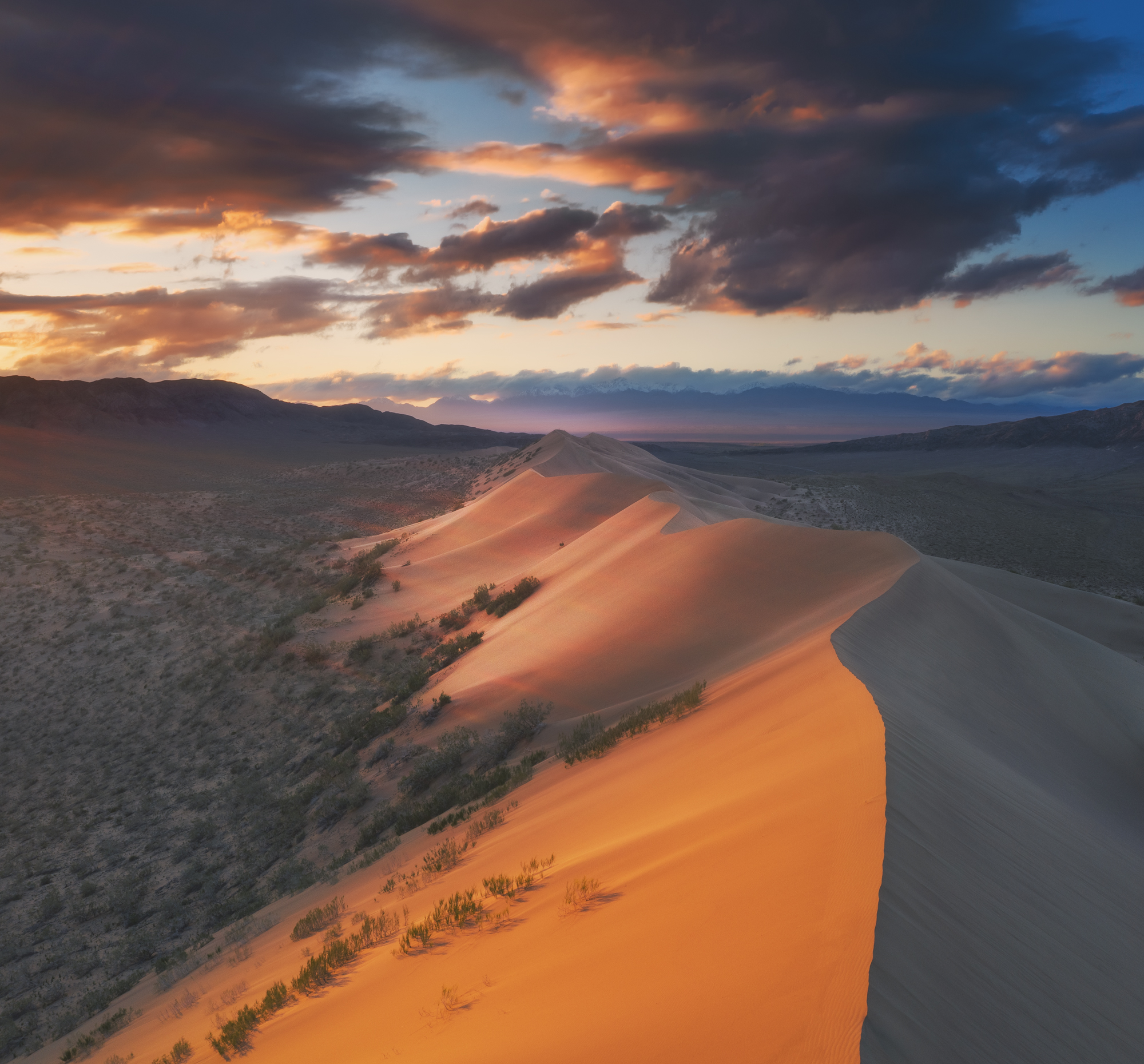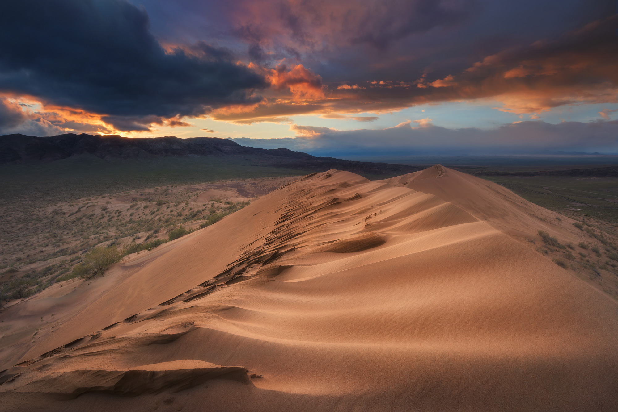 Обед в кафе в поселке Босши, где мы будем получать пропуска в национальный парк. Въезжаем в национальный парк Алтын-Эмель и едем к Поющему бархану и снимаем там закат.
