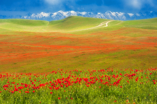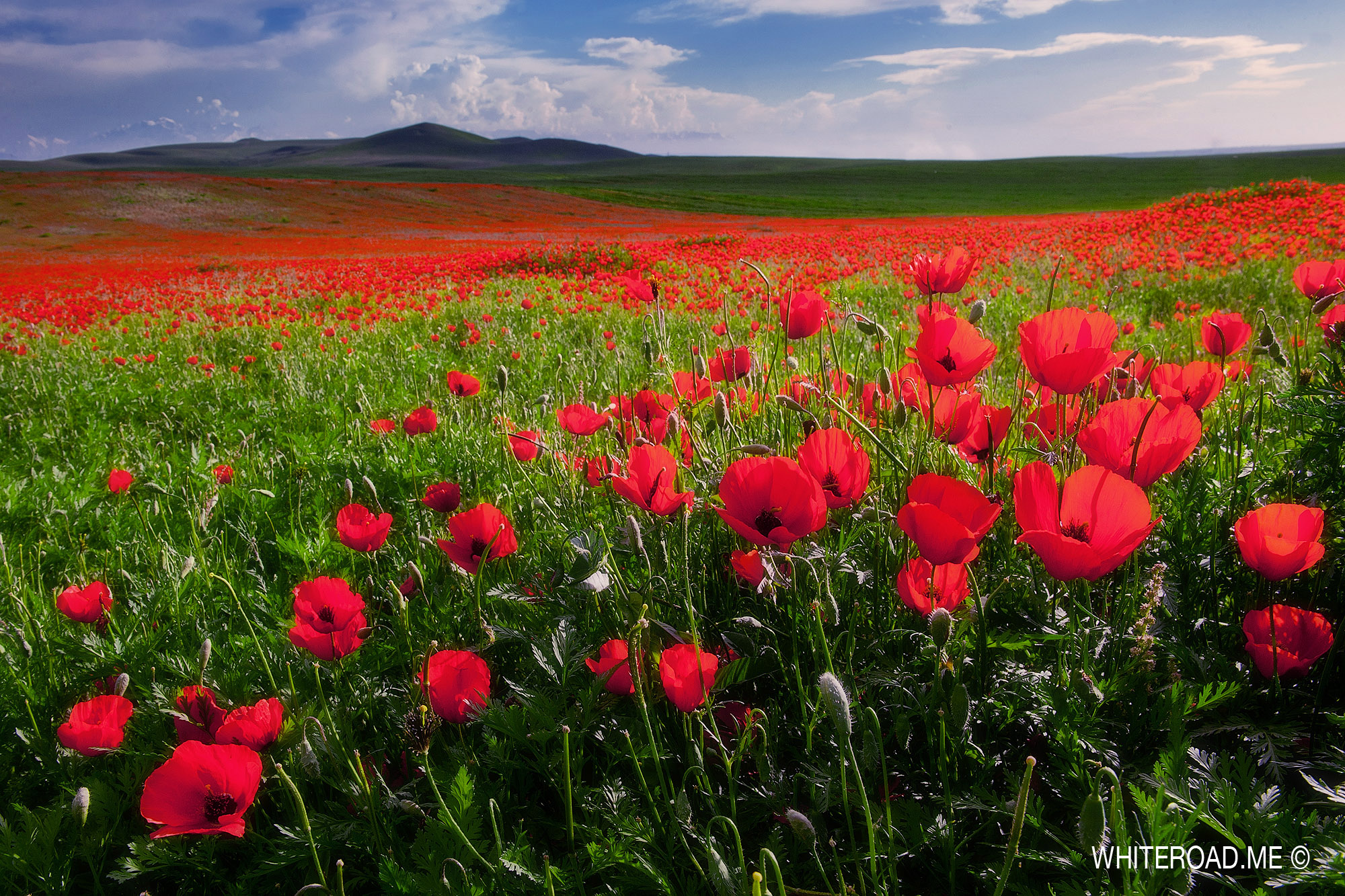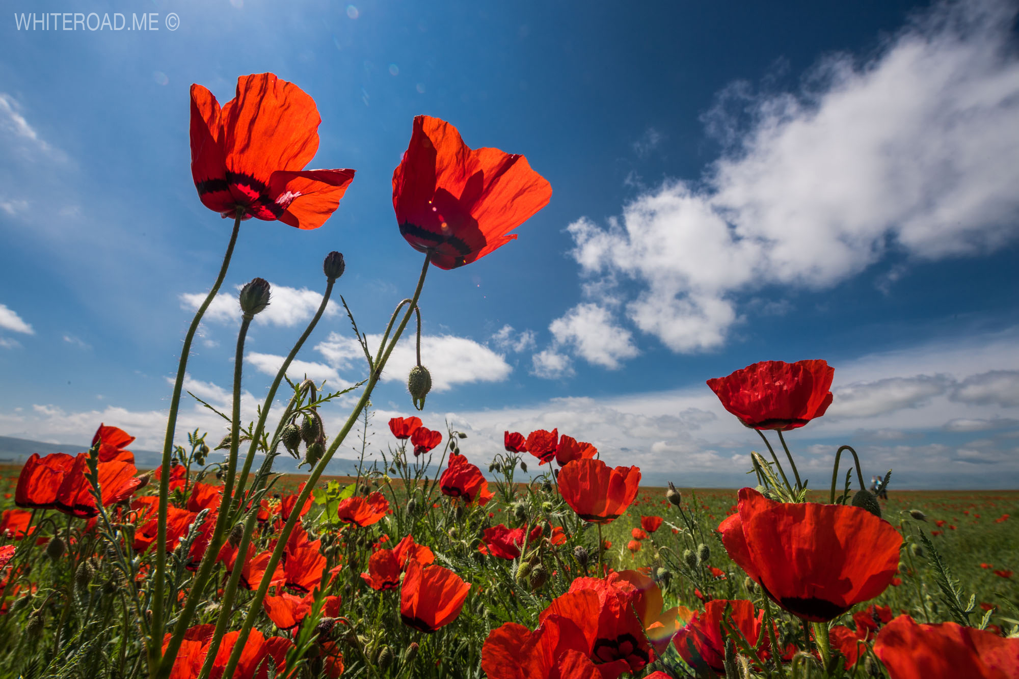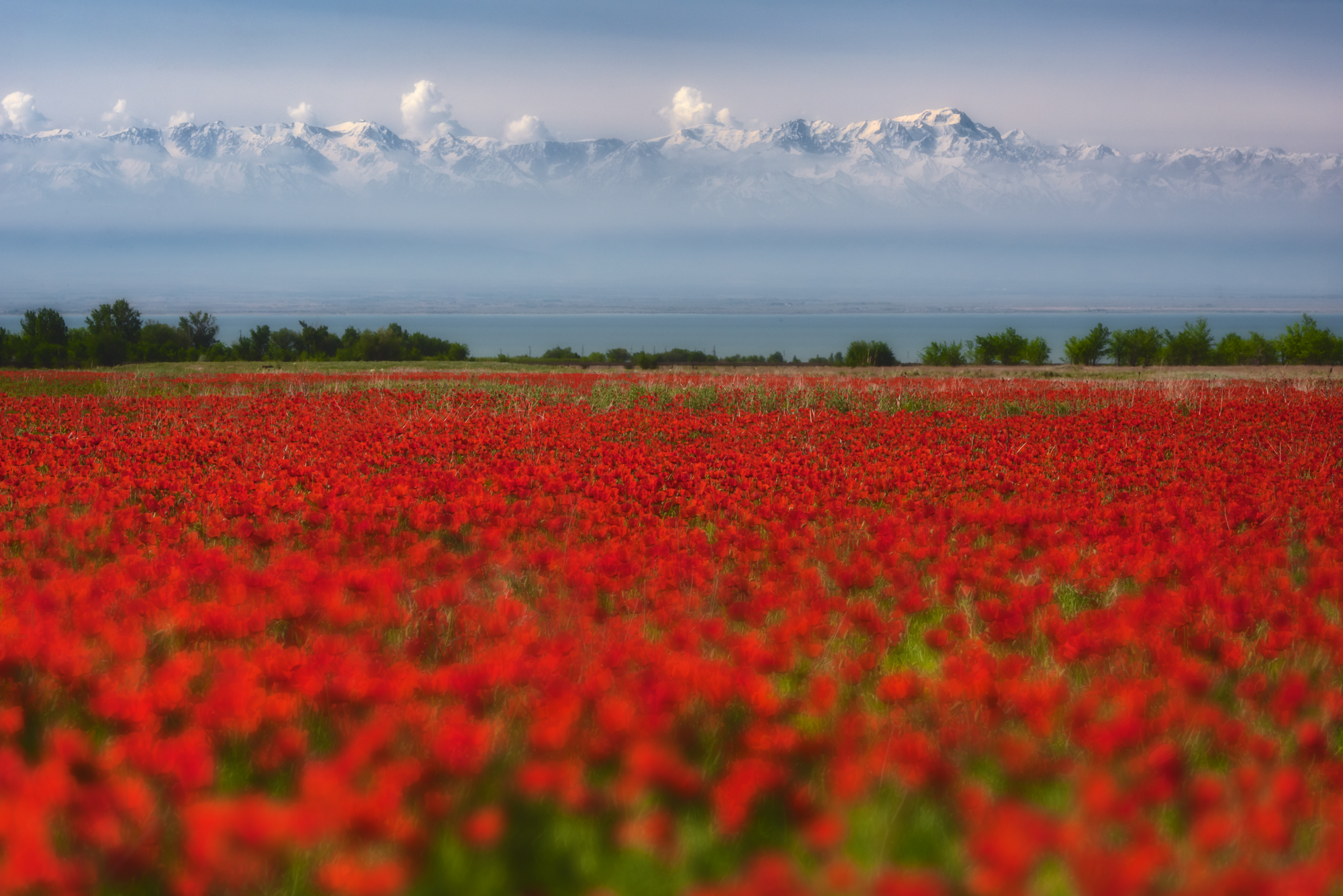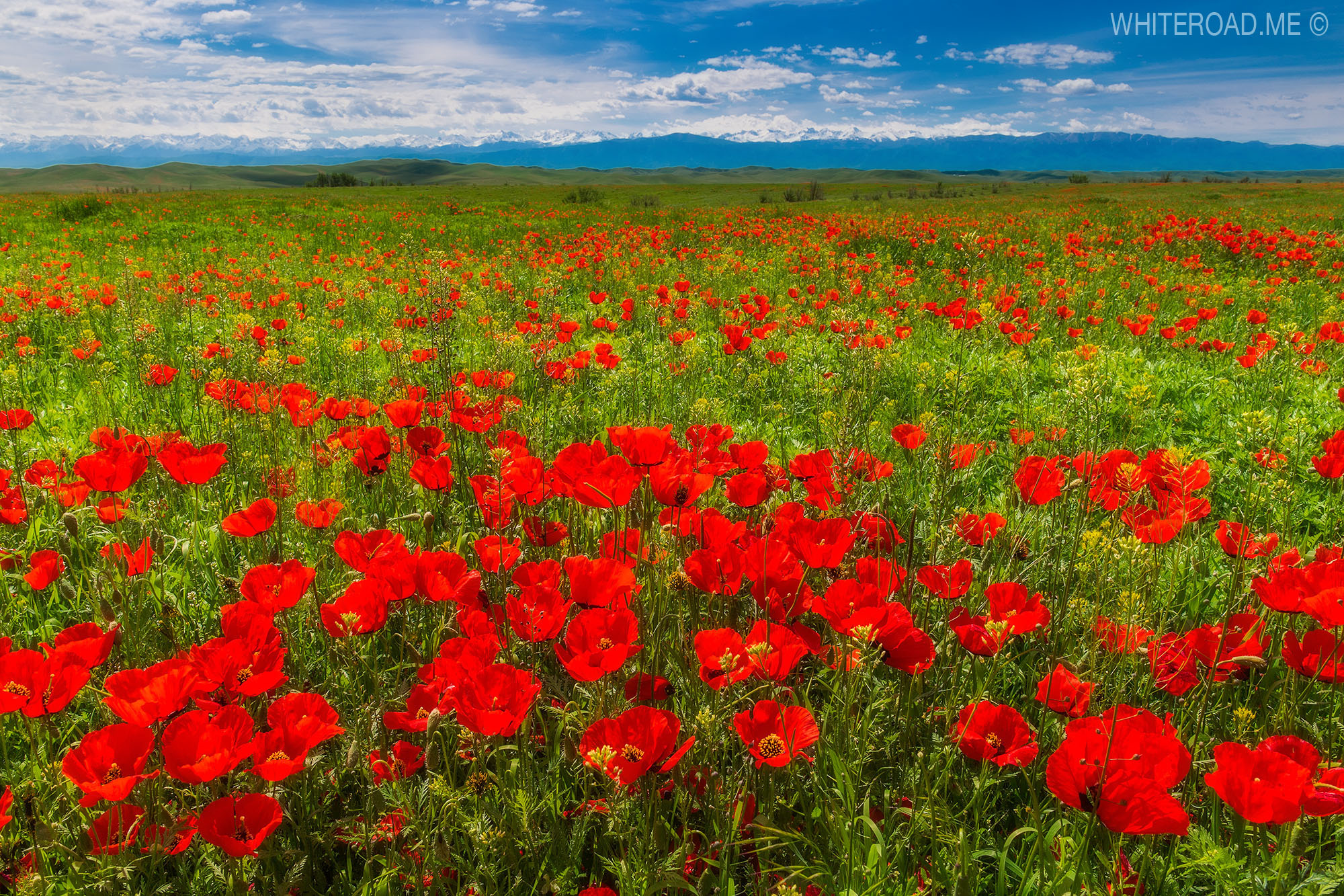 Снимаем рассвет на озерах, собираем вещи и едем в сторону границы с Киргизией, к озеру Туз-Кель. По дороге стоит внимательно смотреть по сторонам, так как именно в это время здесь начинают цвести дикие маки!