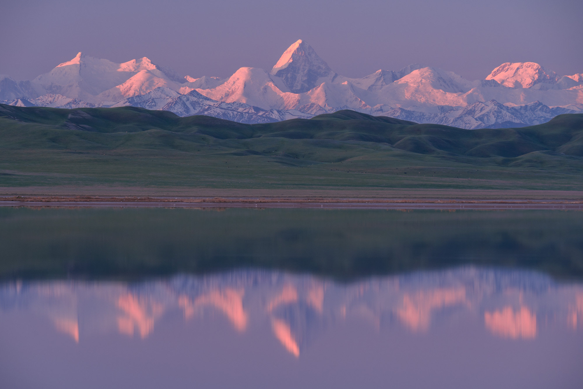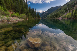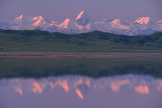 Если повезет с погодой, то в соленом озере будет отражаться гора Хан-Тенгри - один из пяти семитысячников Советского Союза.
