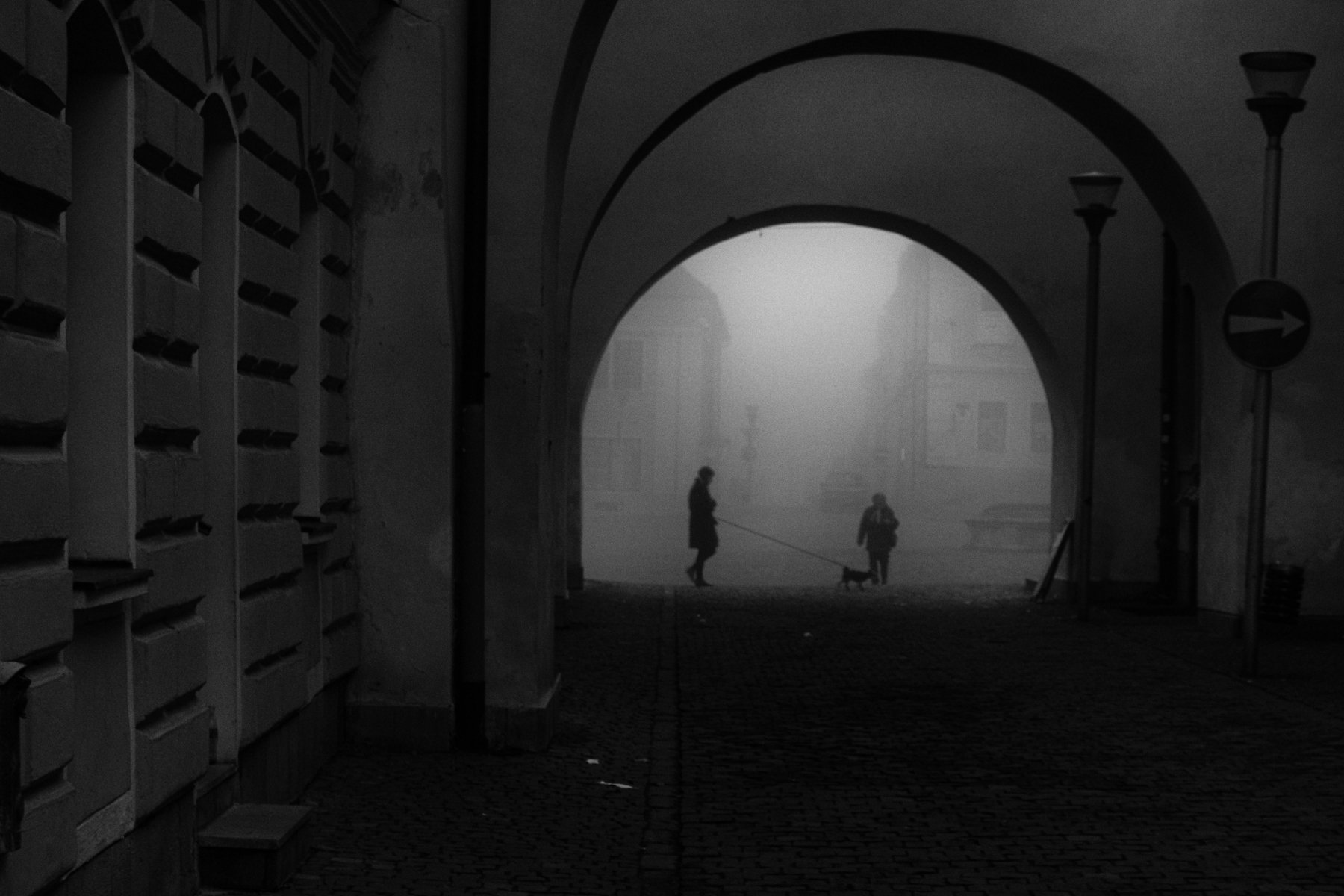 walk in historical town of Bardejov immersed in the mist