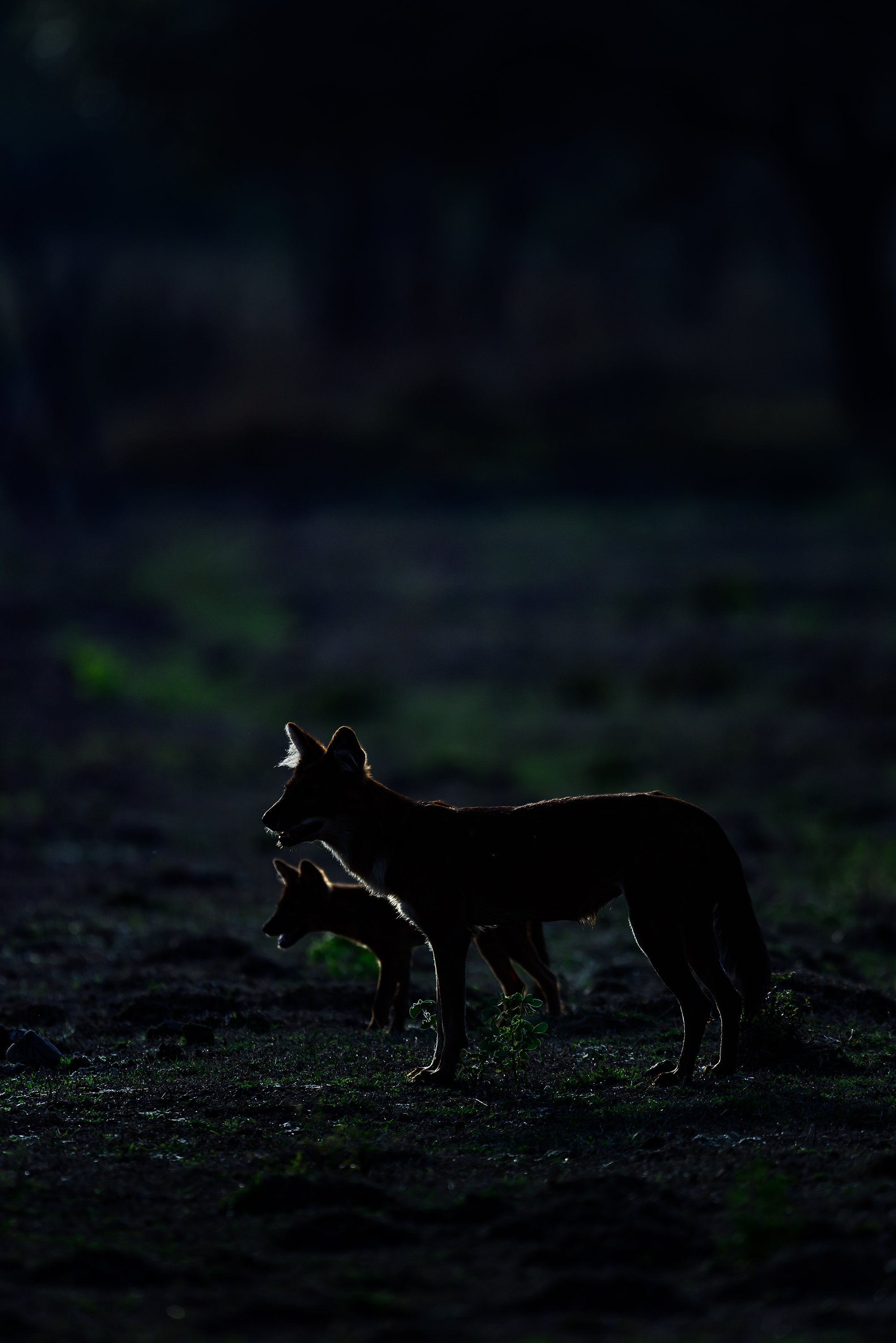 Image made at Tadoba Andheri Tiger Reserve, India. On an evening , a pack of wild dogs going towards a waterhole to quench their thirst and get their pups play in the water.. the father and son had their time and while getting back drying themselves in the grassland gave me an opportunity to try my go at an underexposed image to bring out the highlights of these beauties.