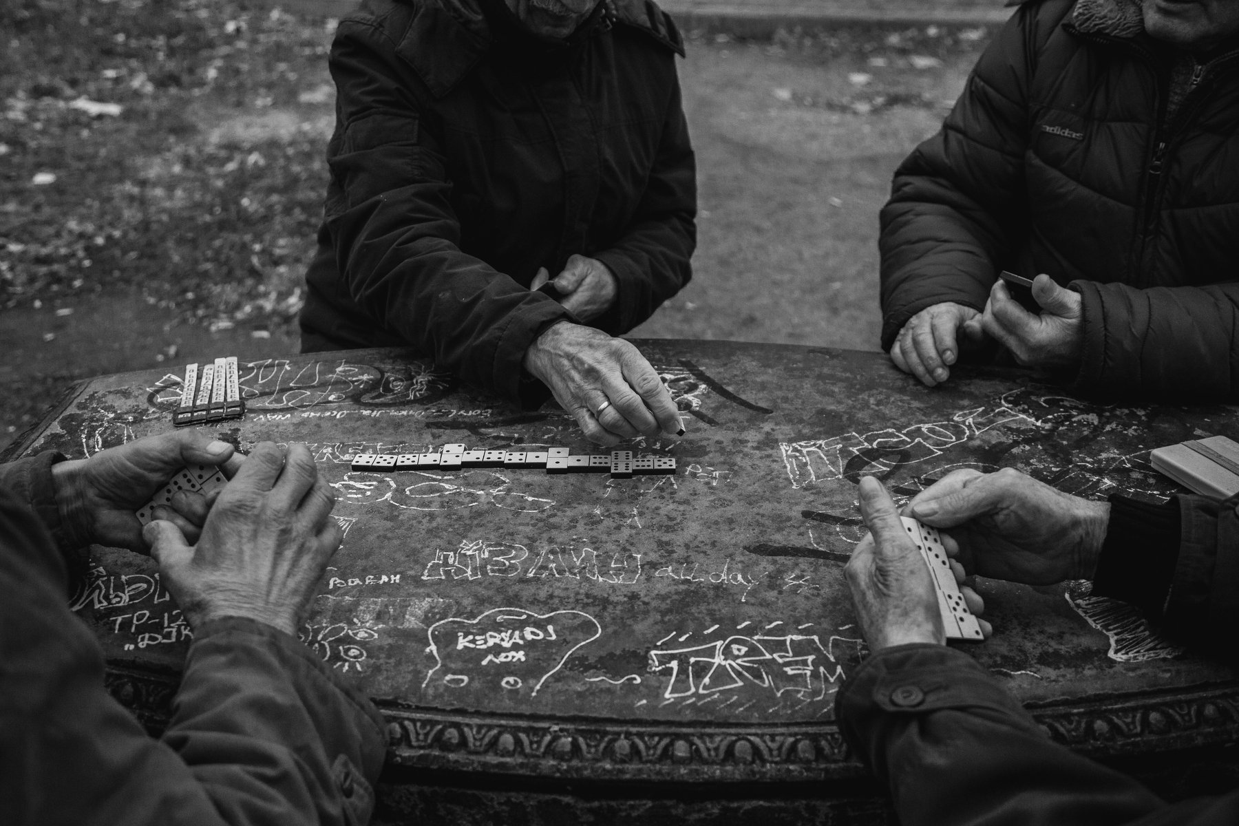 Пожилые мужчины играющие в домино на территории городского парка