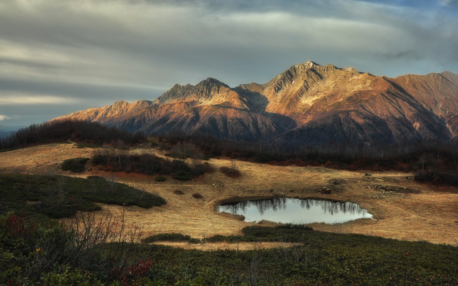 Окрестности Красной Поляны, красивая поляна с озером Зеркальным на отрогах горы Ачишхо, 1850м. На ЗП в лучах заходящего Солнца высочайшая вершина Адыгеи - гора Чугуш (3238.2м).