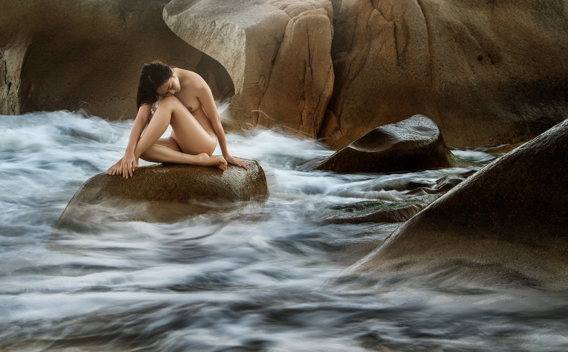 It's almost dark. She sat on the rock and many big waves came. The long exposure is the best choice I think. I ask her to do this pose. Feeling like she's alone in the life, life keep passing by, non-stop. Lonely but who cares, let it lapse.