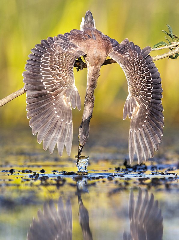 Momento en el que la garcita azulada saca del agua un orillero para alimentarse y como no le alcanza la fuerza de sus patas para elevarse comienza a aletear para tomar impulso hacia arriba.
