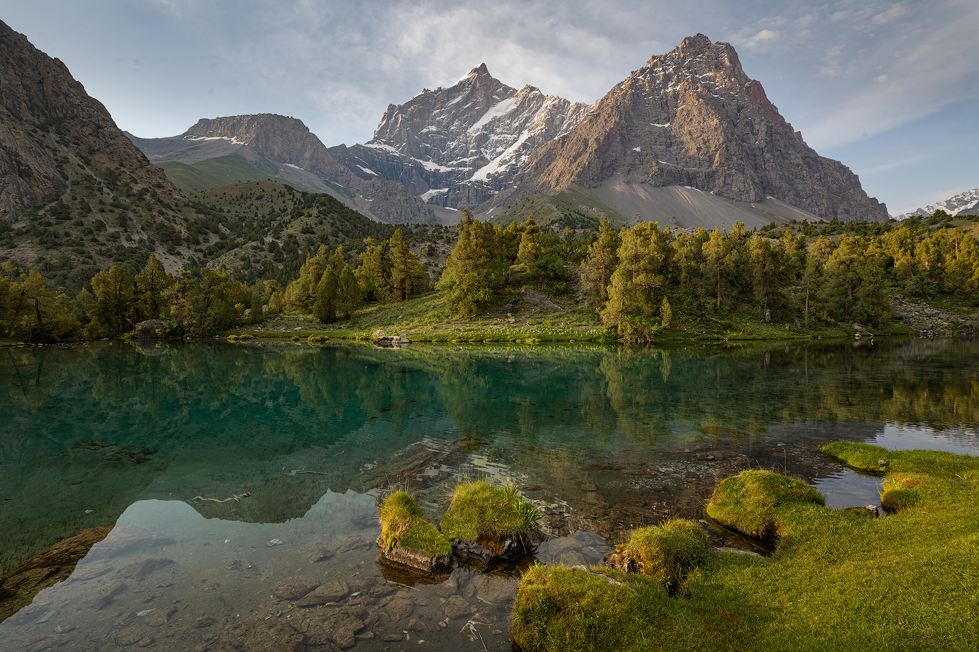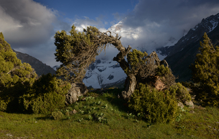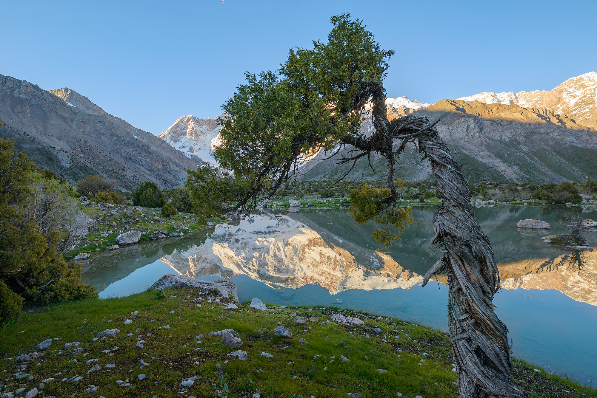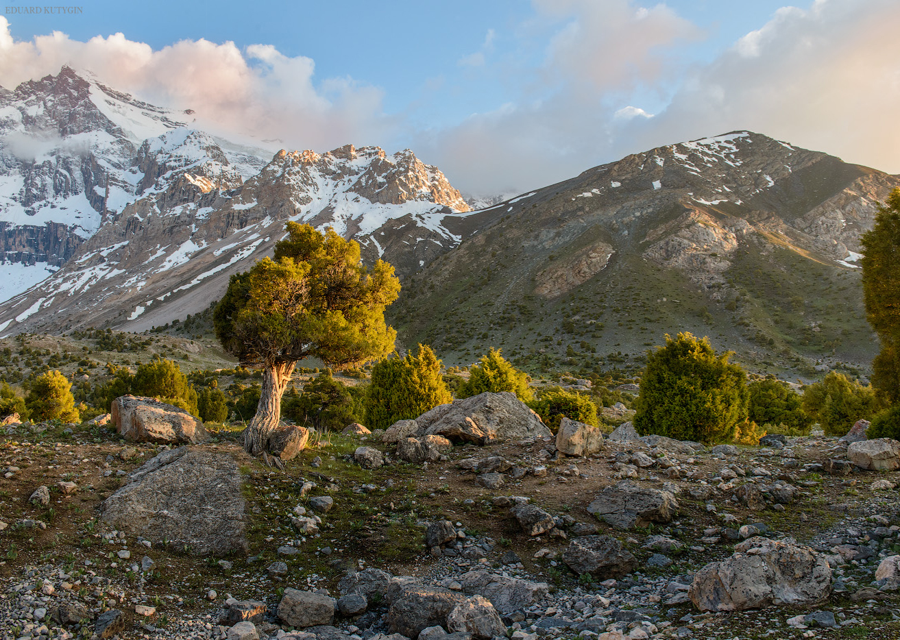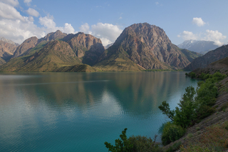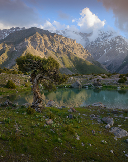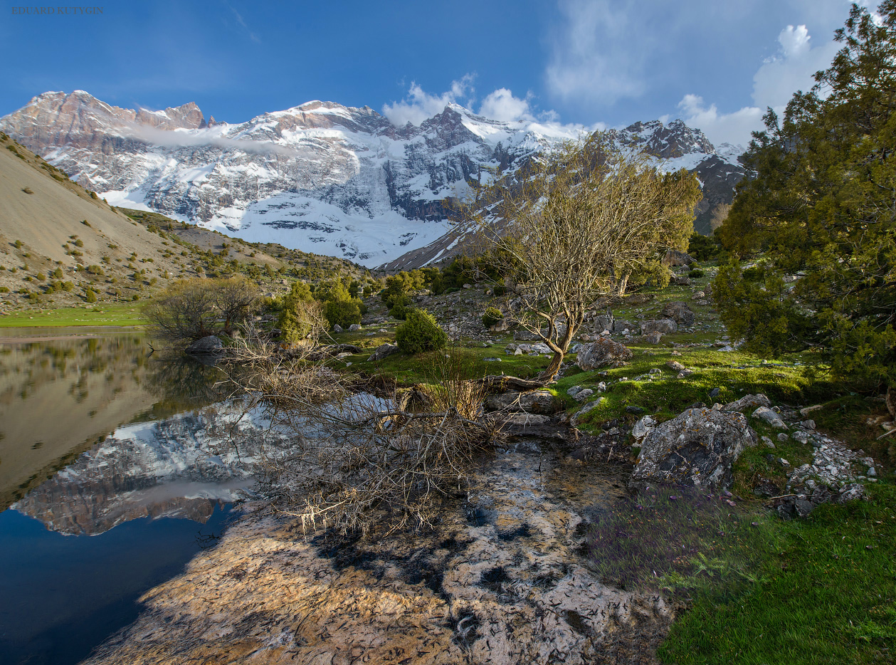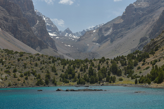 Фанские горы с десятком непохожих друг на друга озёр с цветной водой, высоченными снежными пиками, с очень необычной растительностью, можжевельник Арча, с закрученными стволами.