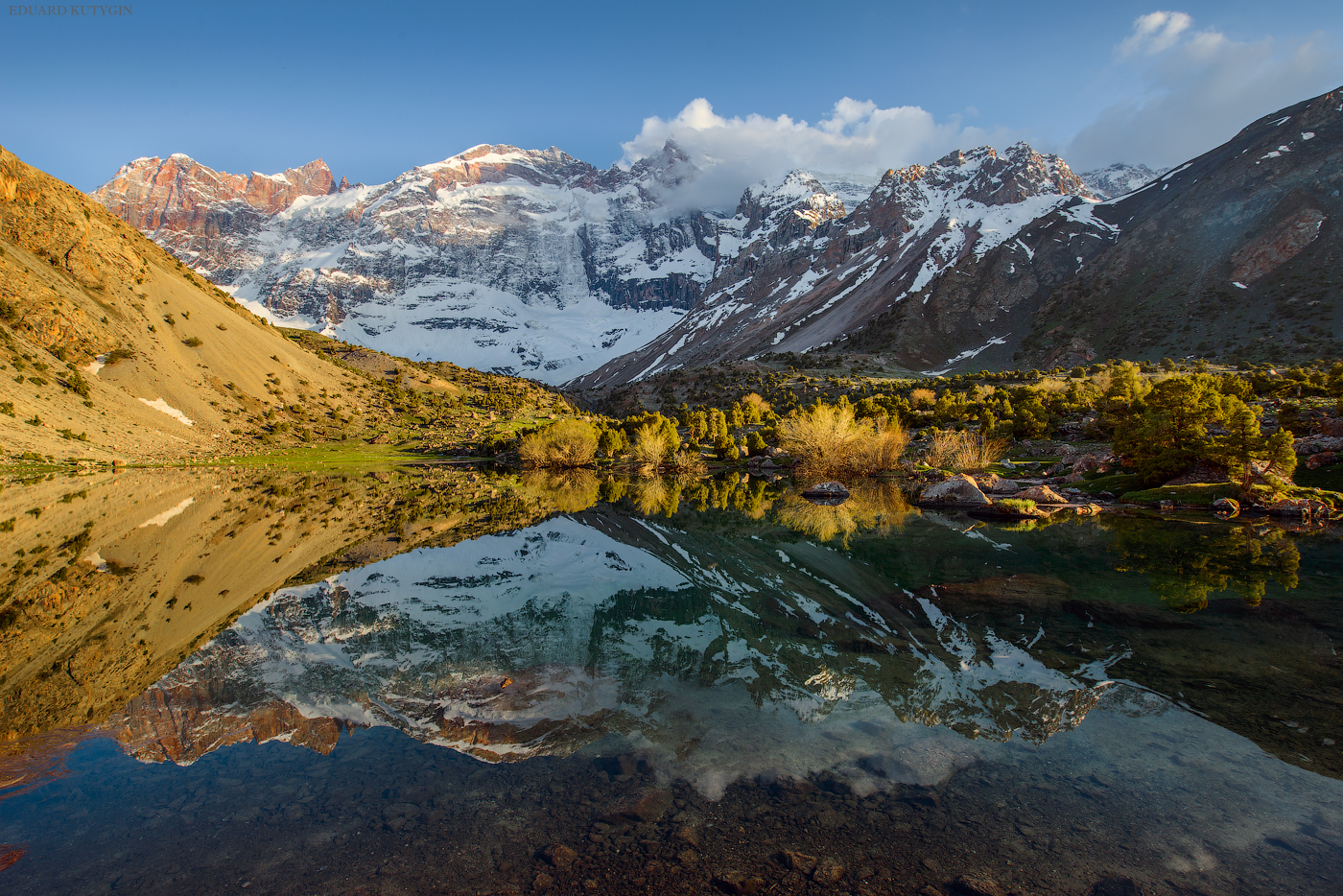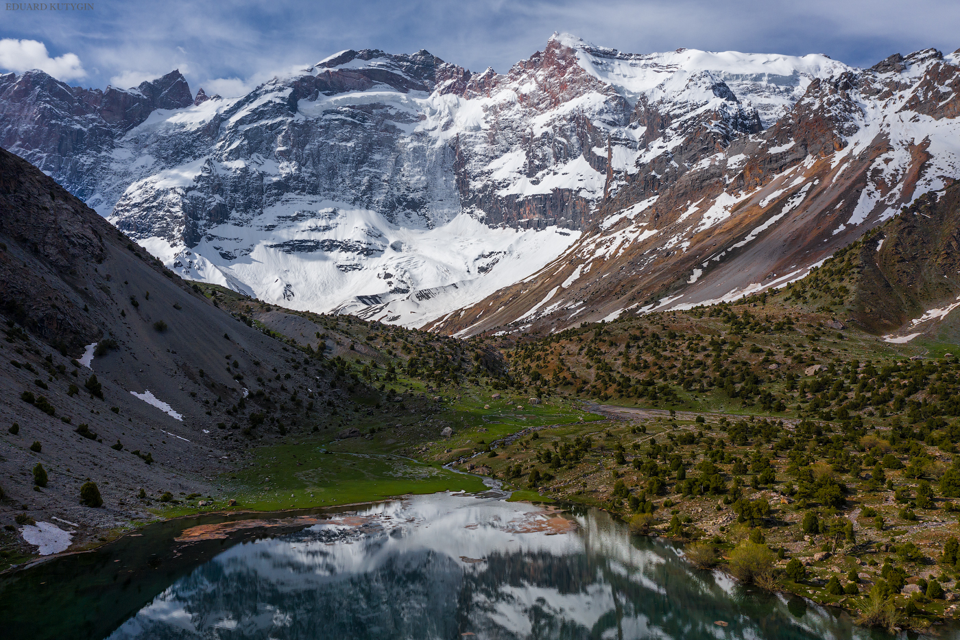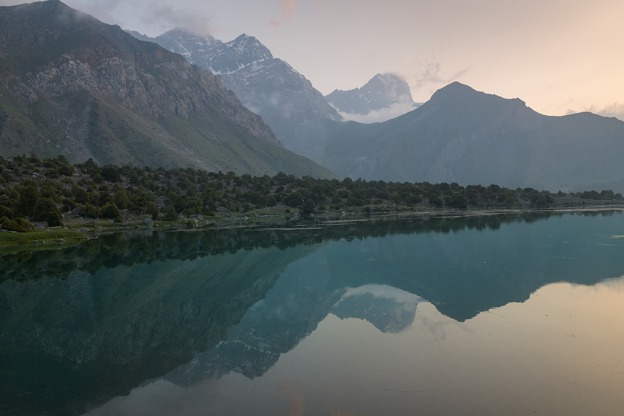 Фанские горы с десятком непохожих друг на друга озёр с цветной водой, высоченными снежными пиками, с очень необычной растительностью, можжевельник Арча, с закрученными стволами.