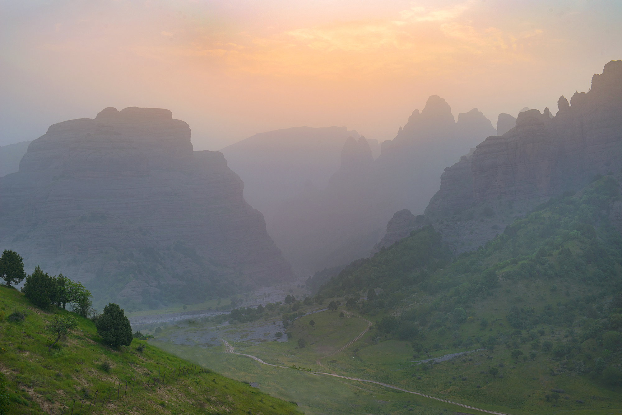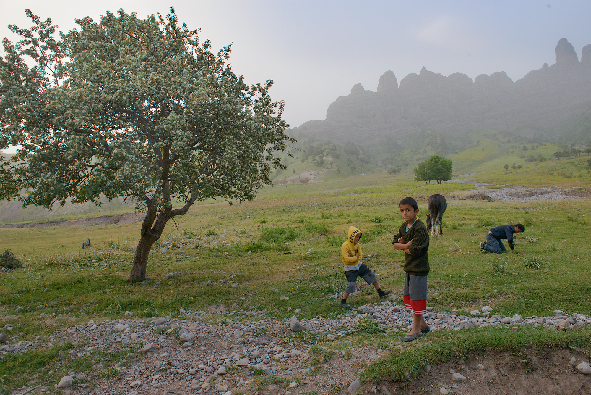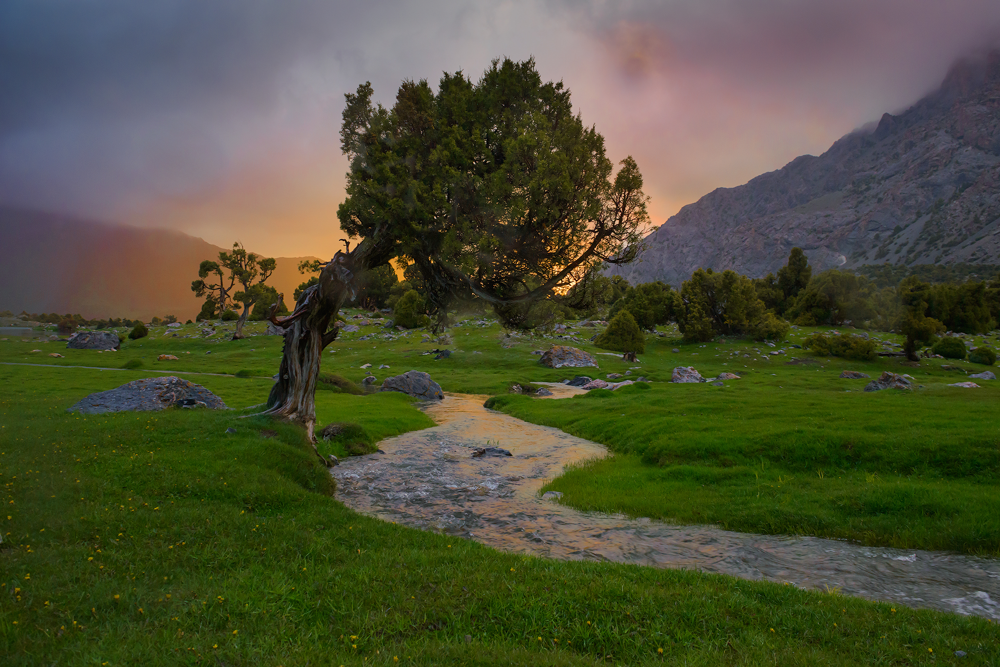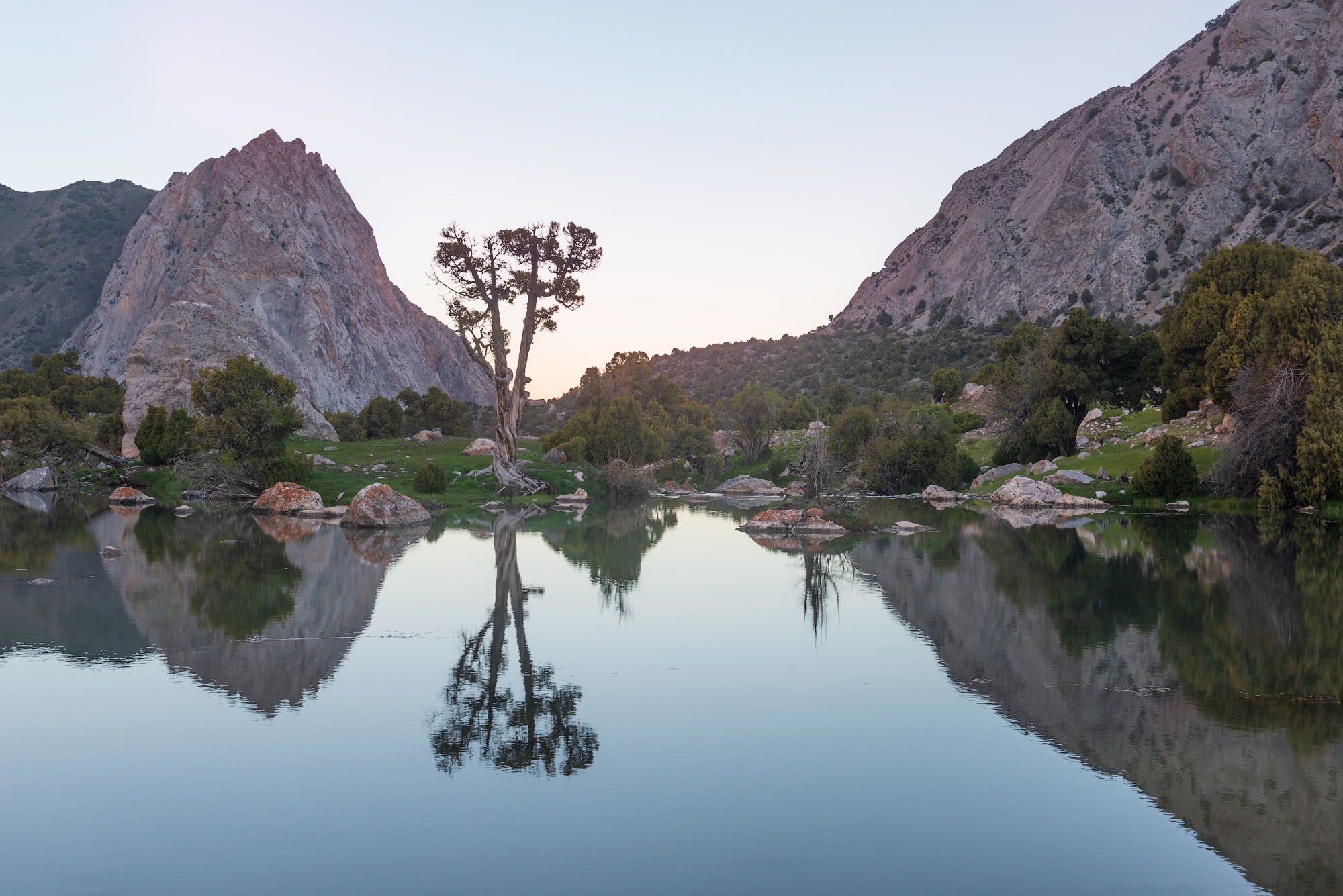 Фанские горы с десятком непохожих друг на друга озёр с цветной водой, высоченными снежными пиками, с очень необычной растительностью, можжевельник Арча, с закрученными стволами.