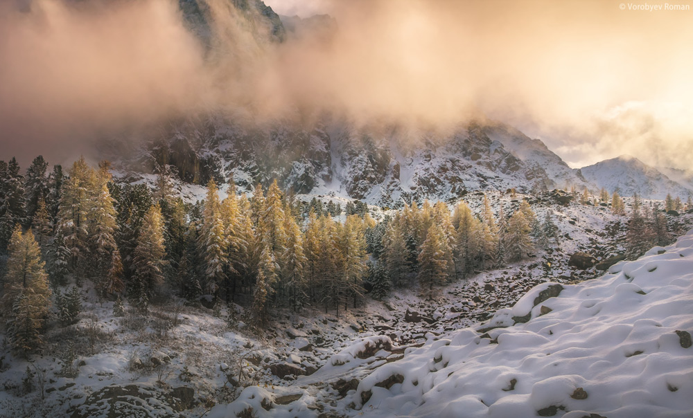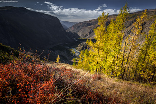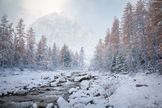 Сегоднешний день заложен на свободные прогулки по ущелью в поисках интересных сюжетов для фотографий среди желтых листвениц. Утреняя и вечерняя съемка на реке Актру.