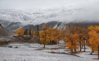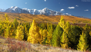 Золотая осень на Алтае удивительное время, разнообразие различных красок и состояний природы. В реках вода приобретает изумрудные оттенки, вершины хребтов уже припорошены снегом, а лиственницы надевают желтые платья это поистине сказочное сочетание.