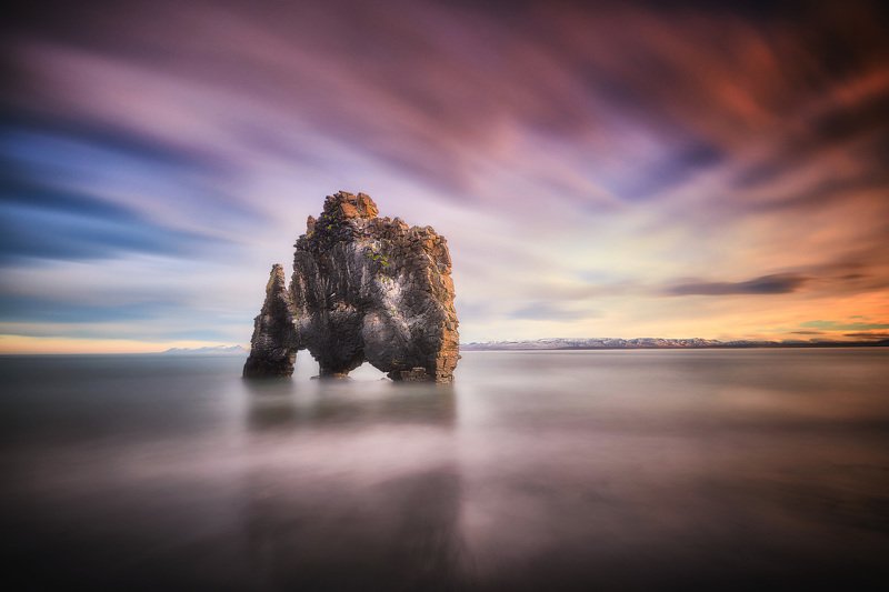 Hvítserkur, otherwise known as the Troll of Northwest Iceland, is a 15 m (49 ft) tall basalt rock stack protruding from Húnaflói Bay. This "Bull" shaped rock stack attracts many tourists and Photographers due to the way the sun, moon, and aurora borealis reflect off of the flat water around its distinctive form.