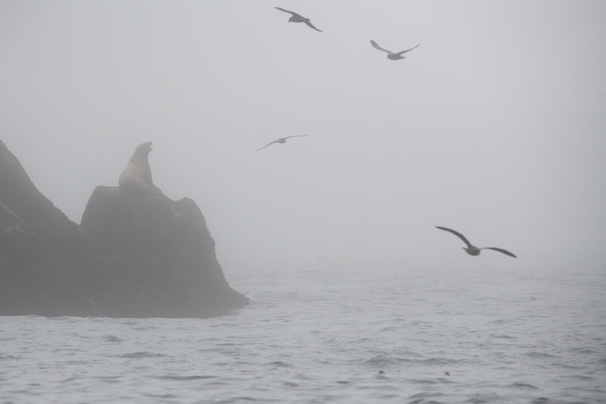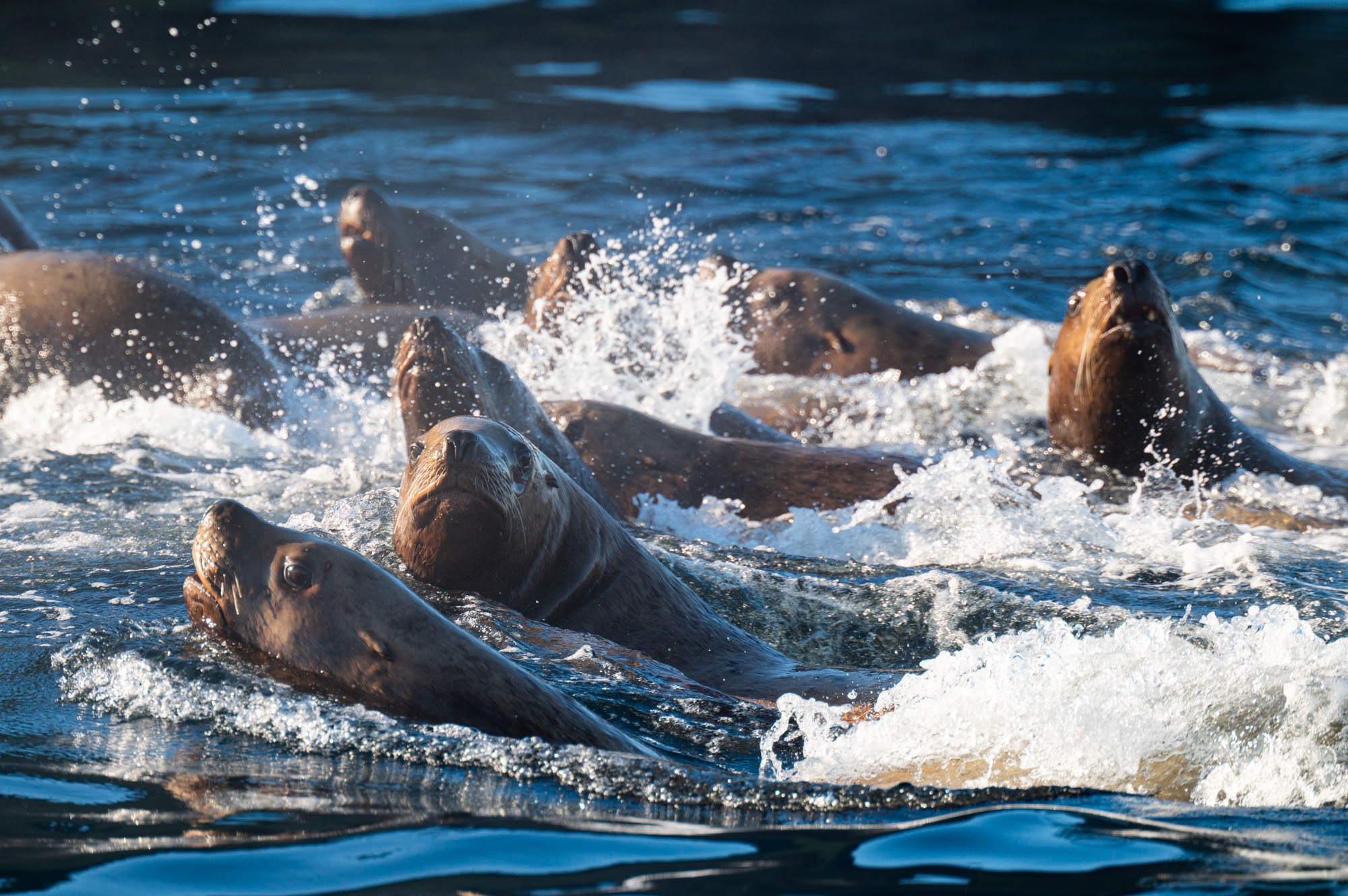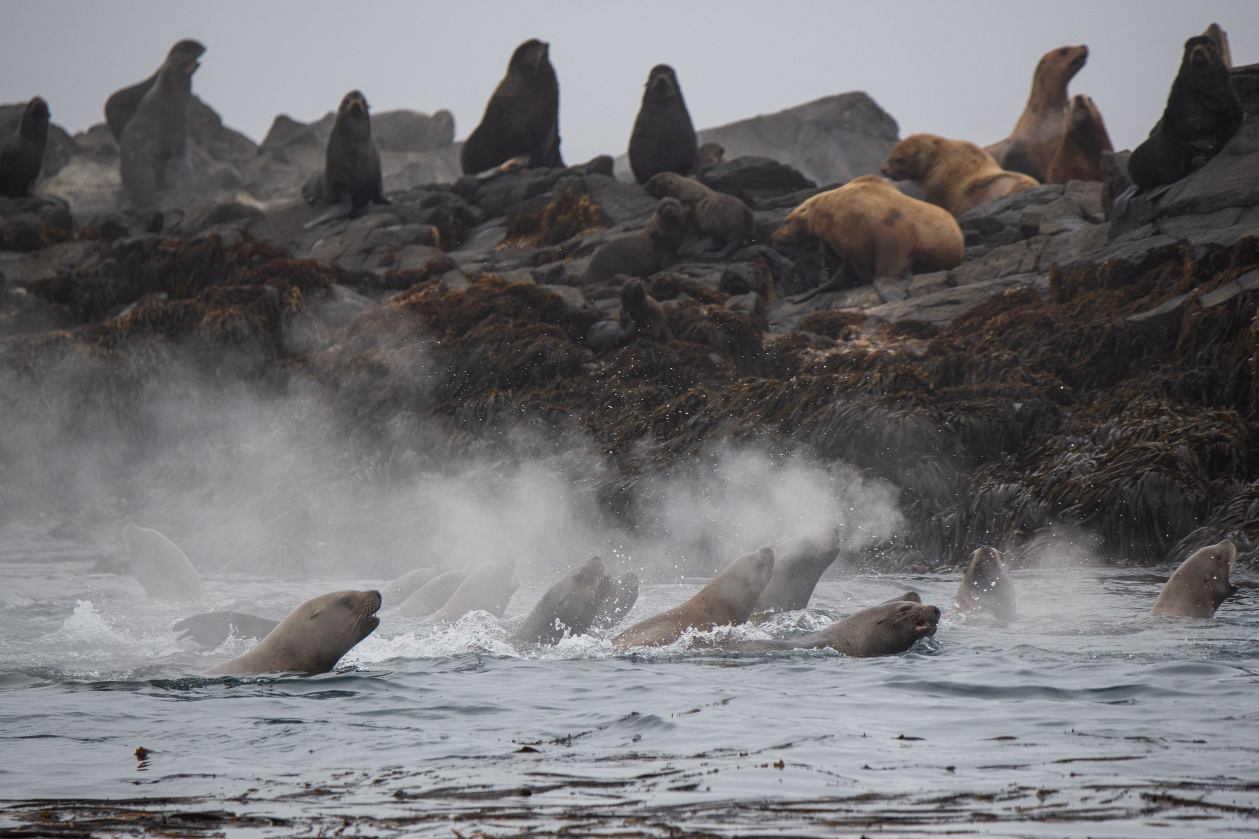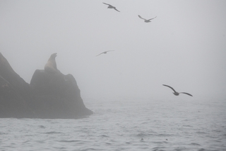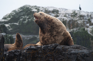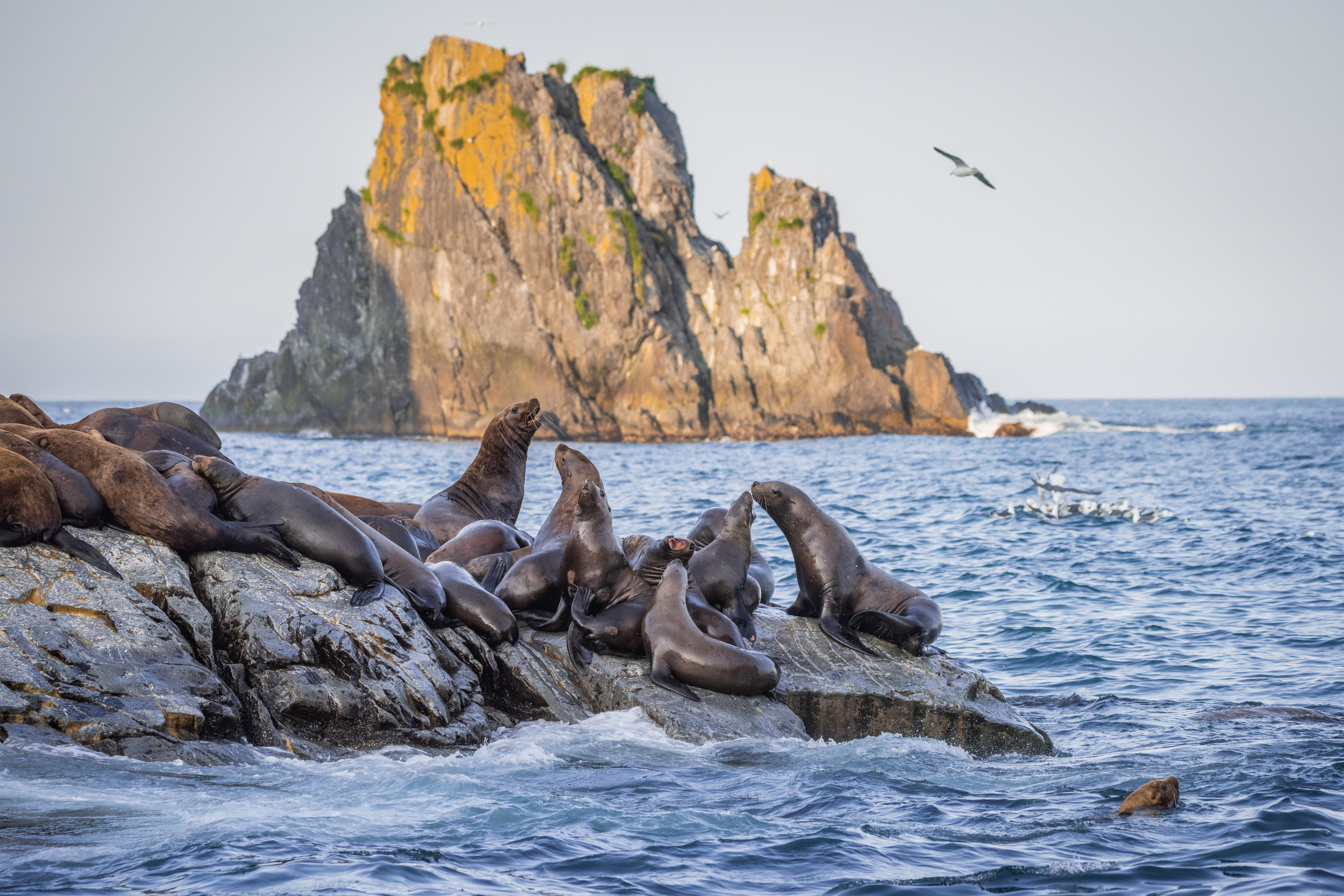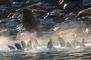 В районе рассвета приходим на остров Брат Чирпоев и знакомимся с его обитателями - морскими львами Стеллера. Или просто сивучами. Смотрим за их повадками, фотографируем.