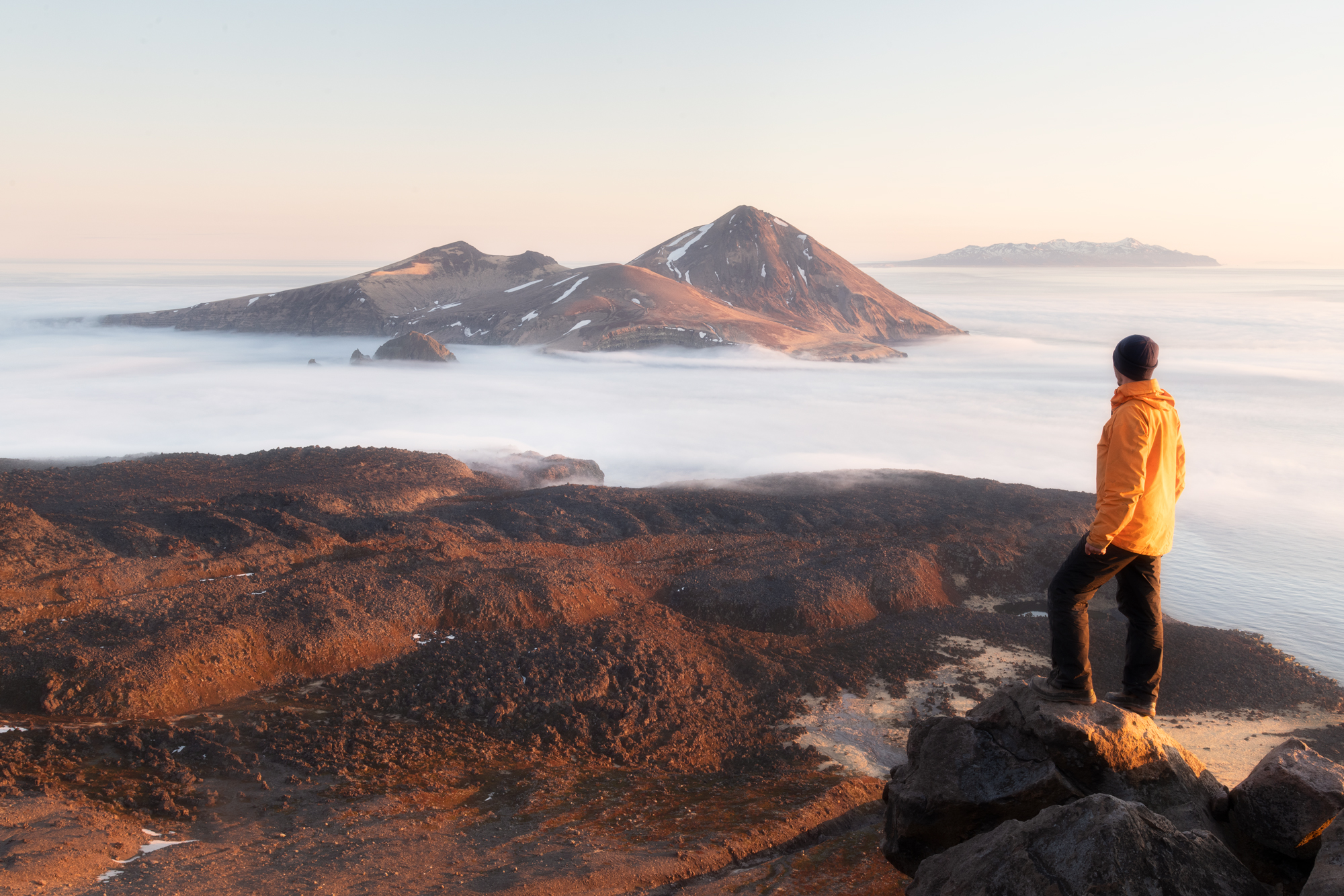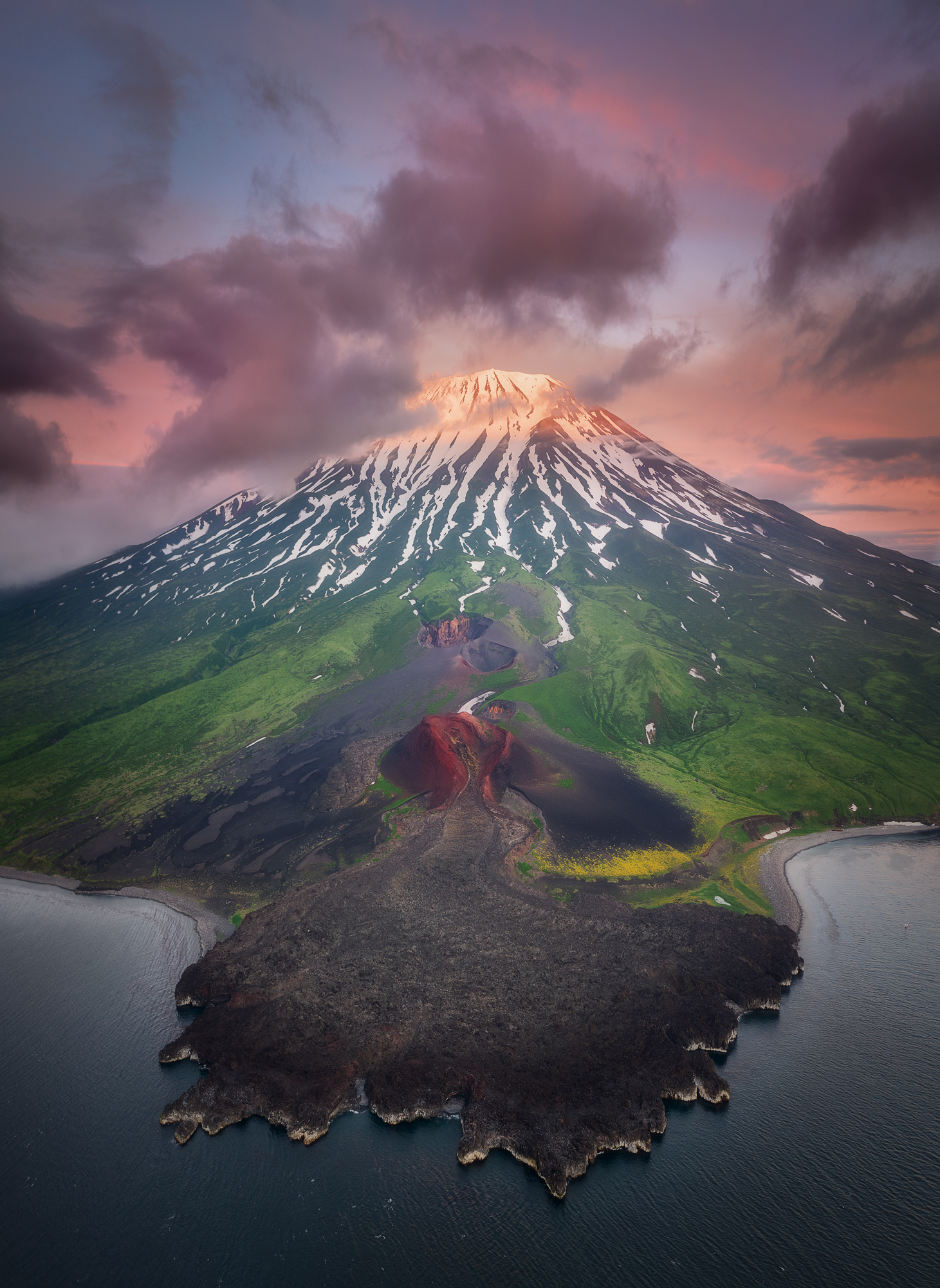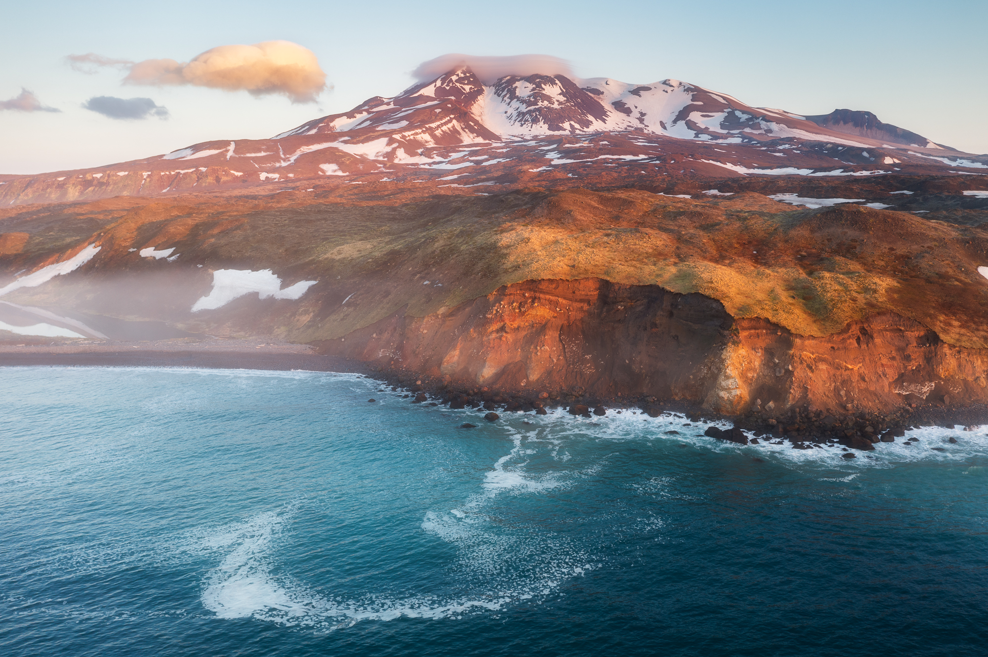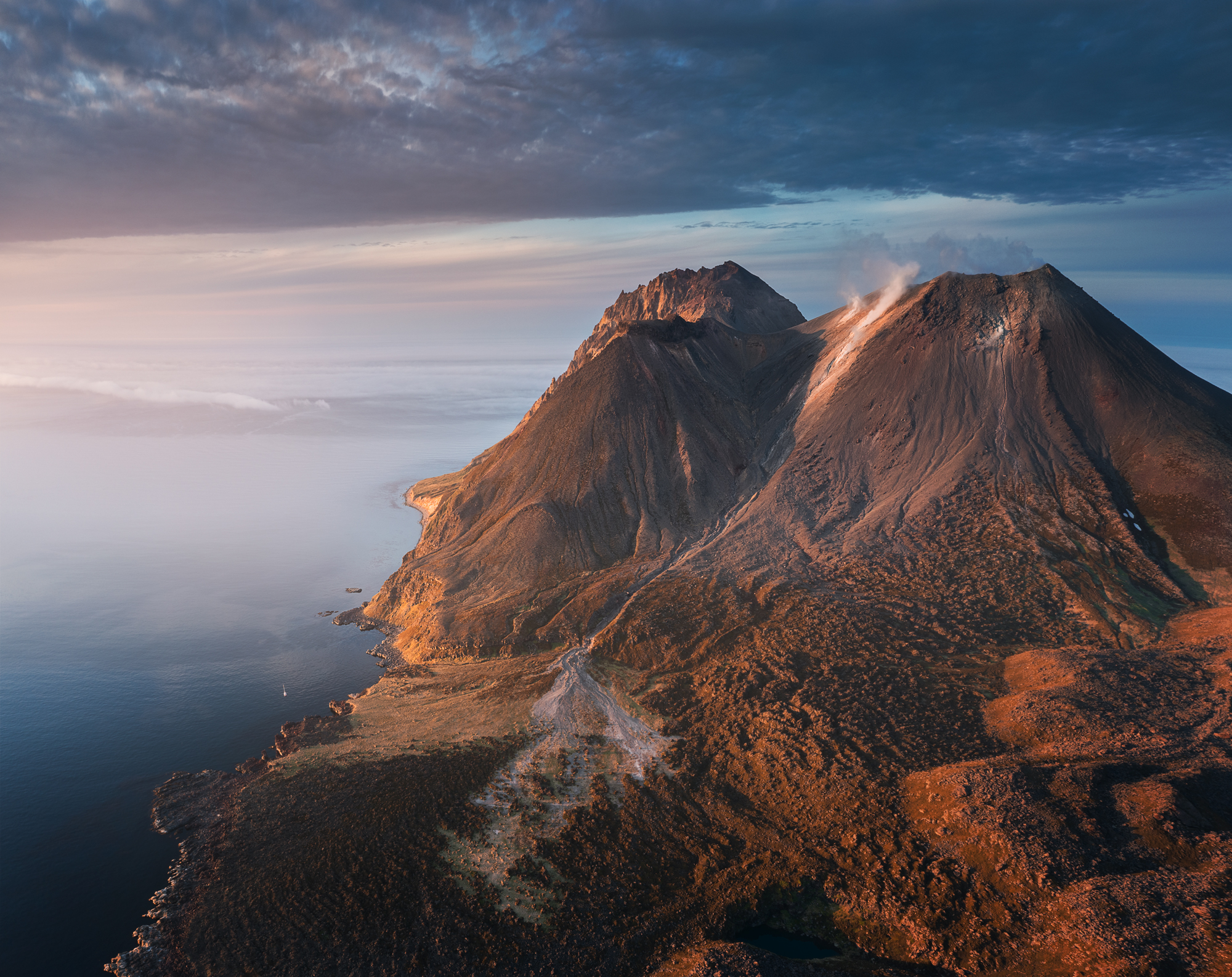 Но Такетоми - не единственная интересная точка на острове Атласова. Другая наша съемочная локация - Олимпийский прорыв. Конус извержения 1972 года с огромным лавовым потоком, который прорвался к океану и сформировал целый новый мыс. Если повезет со светом, то с вершины Олимпийского прорыва открывается впечатляющий вид на вулкан Алаид.