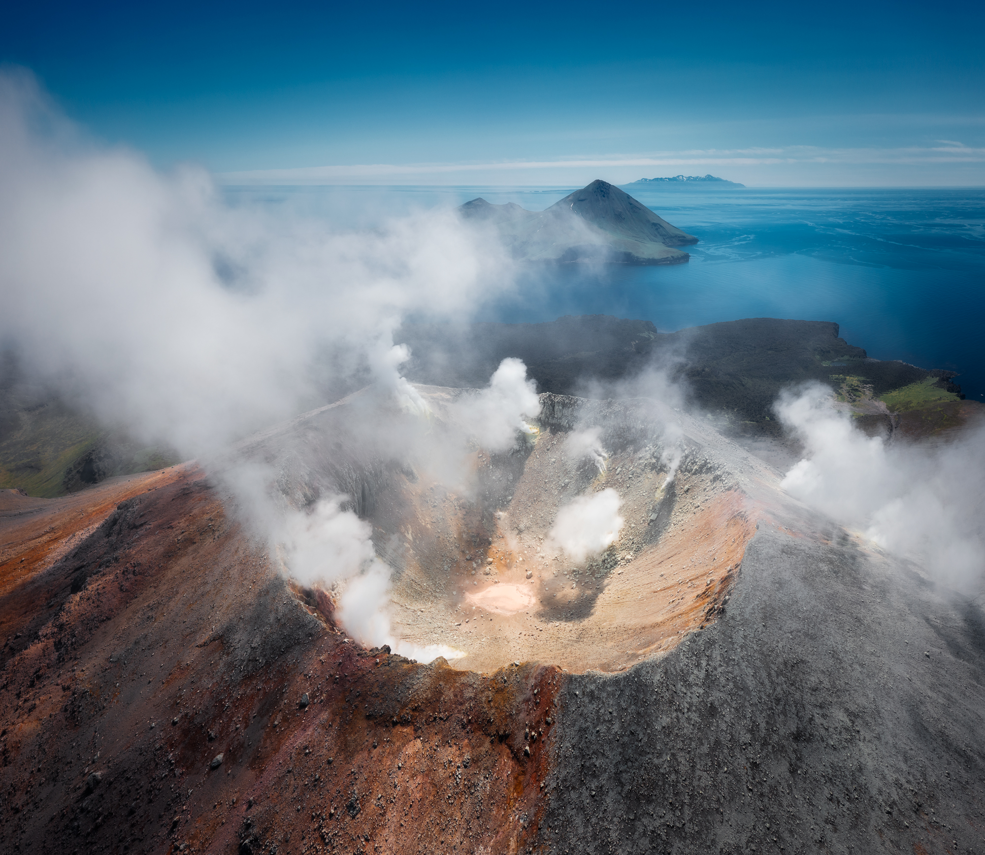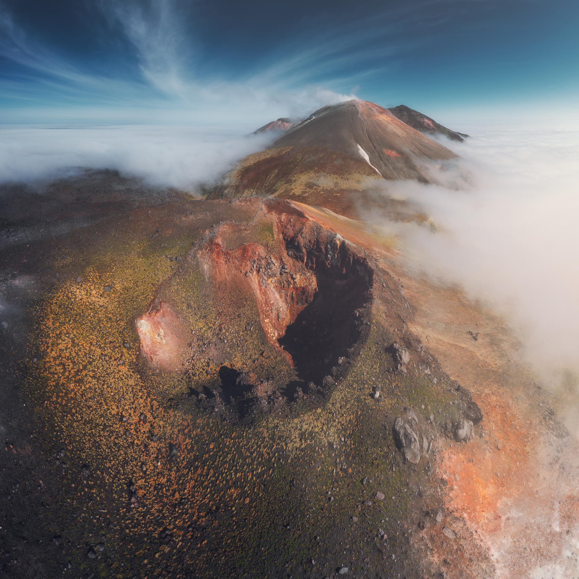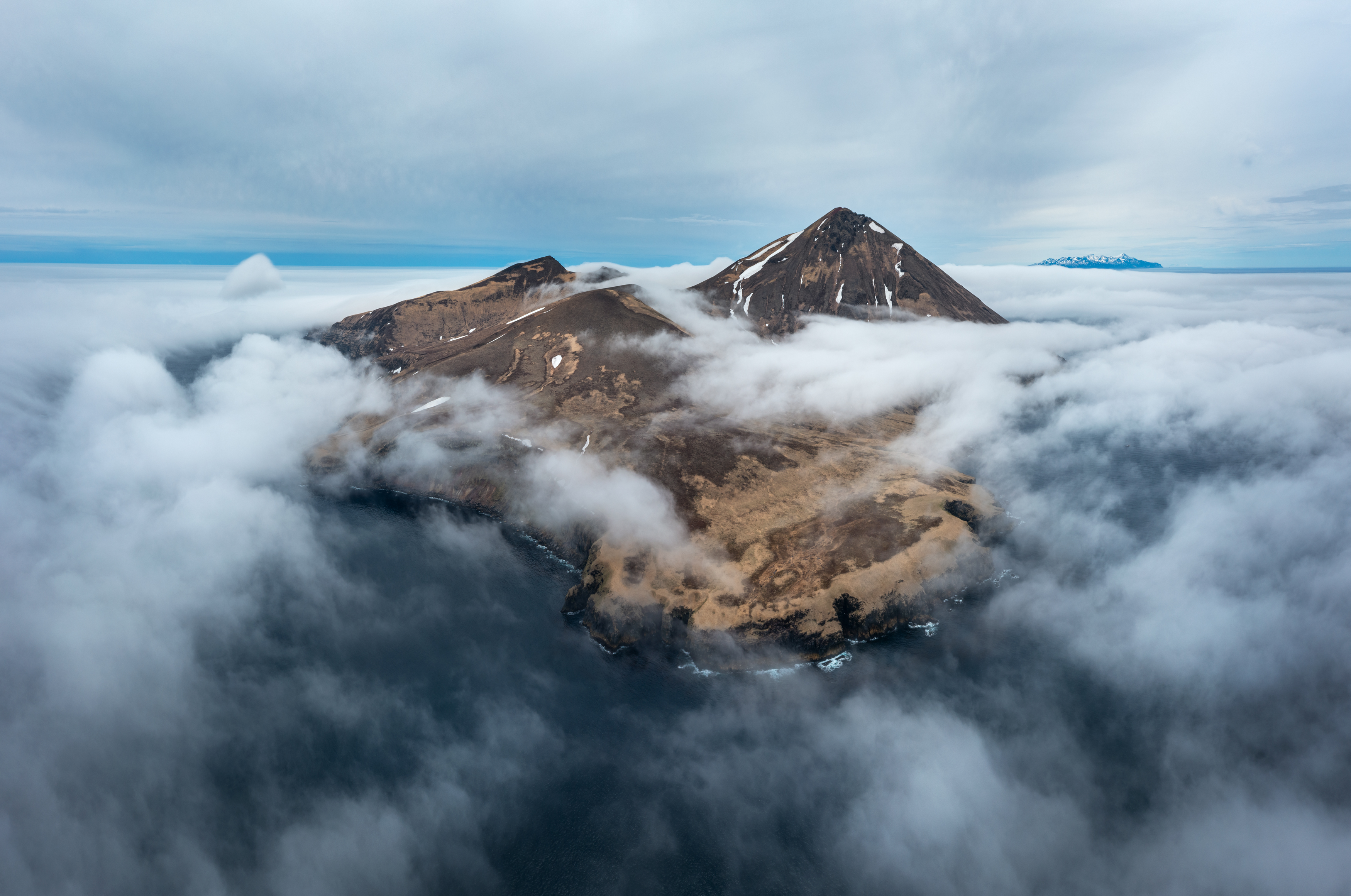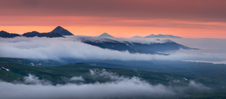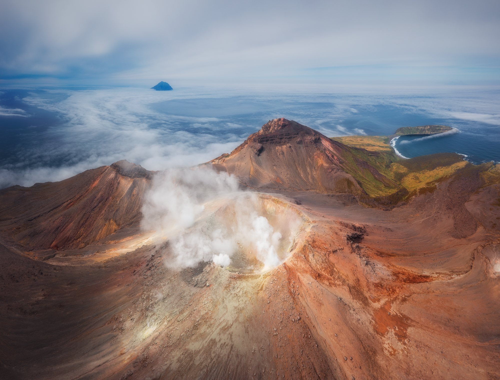 Но Такетоми - не единственная интересная точка на острове Атласова. Другая наша съемочная локация - Олимпийский прорыв. Конус извержения 1972 года с огромным лавовым потоком, который прорвался к океану и сформировал целый новый мыс. Если повезет со светом, то с вершины Олимпийского прорыва открывается впечатляющий вид на вулкан Алаид.