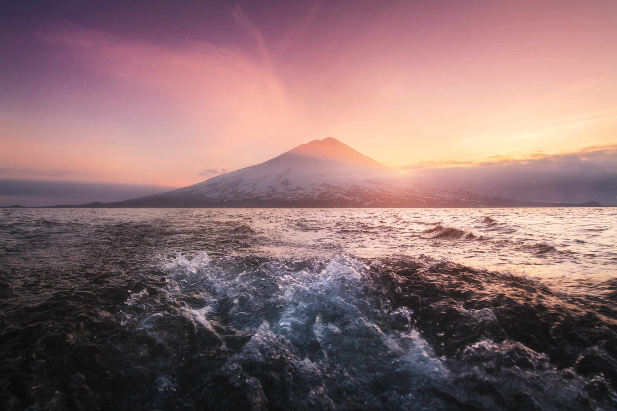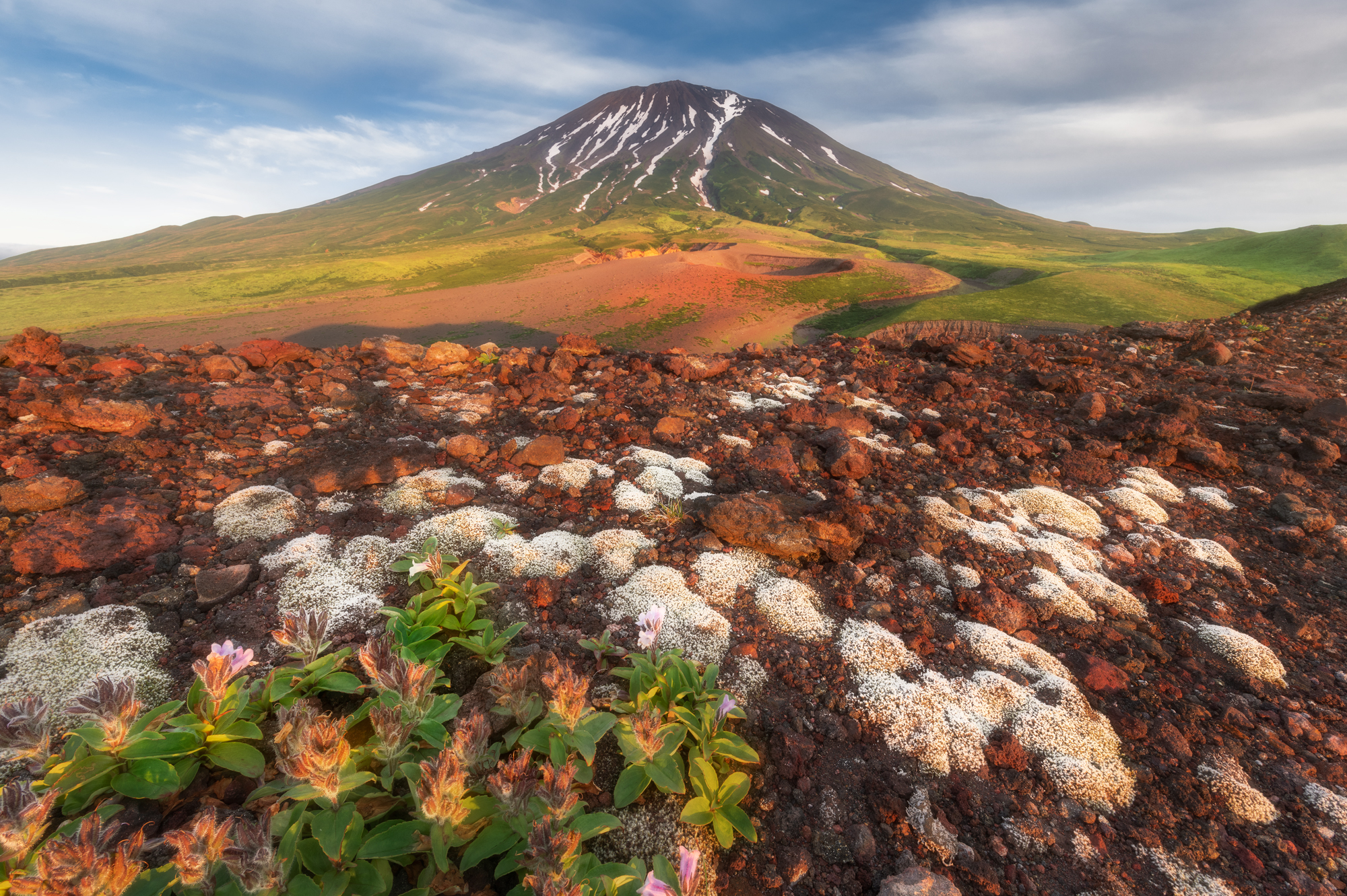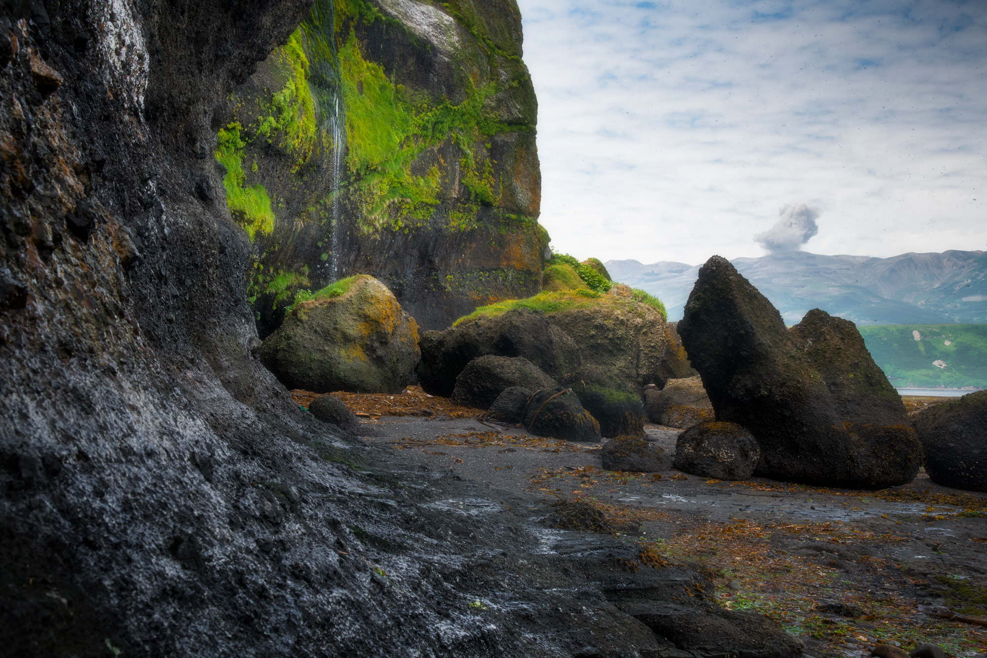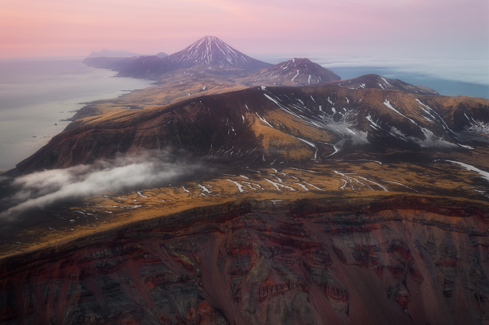 Но Такетоми - не единственная интересная точка на острове Атласова. Другая наша съемочная локация - Олимпийский прорыв. Конус извержения 1972 года с огромным лавовым потоком, который прорвался к океану и сформировал целый новый мыс. Если повезет со светом, то с вершины Олимпийского прорыва открывается впечатляющий вид на вулкан Алаид.
