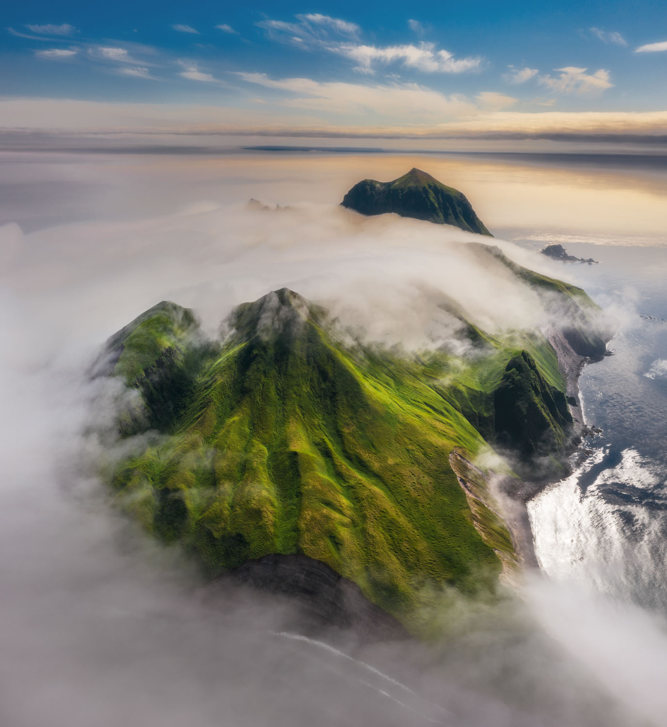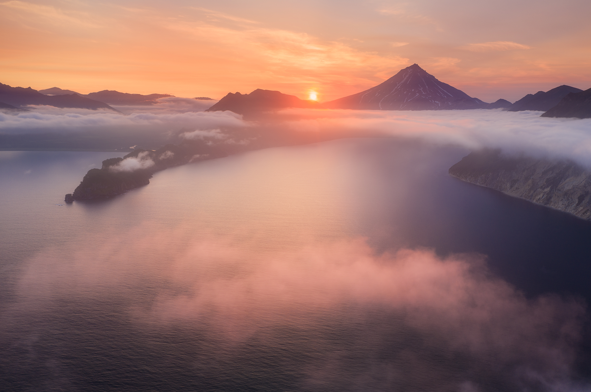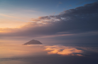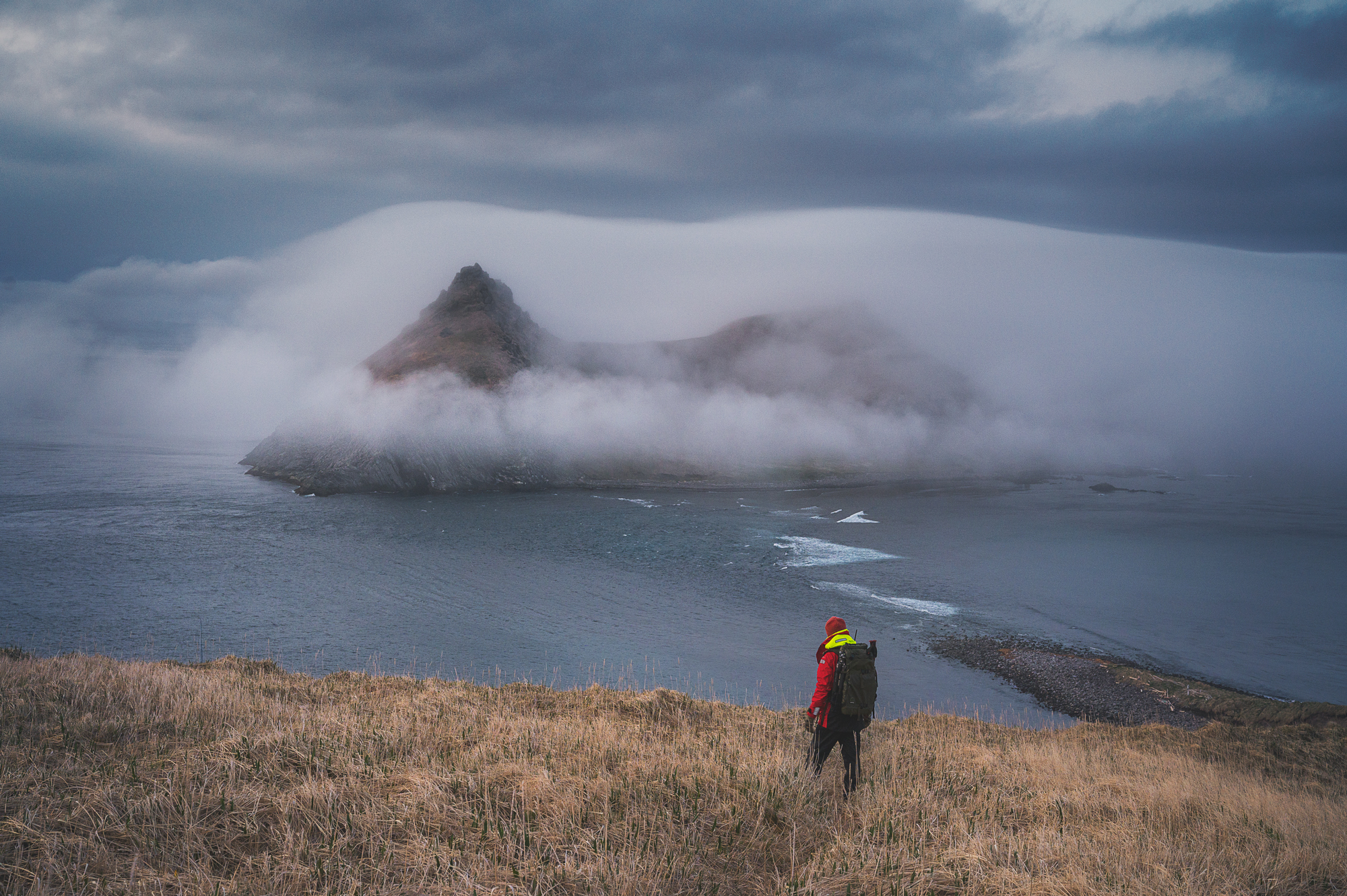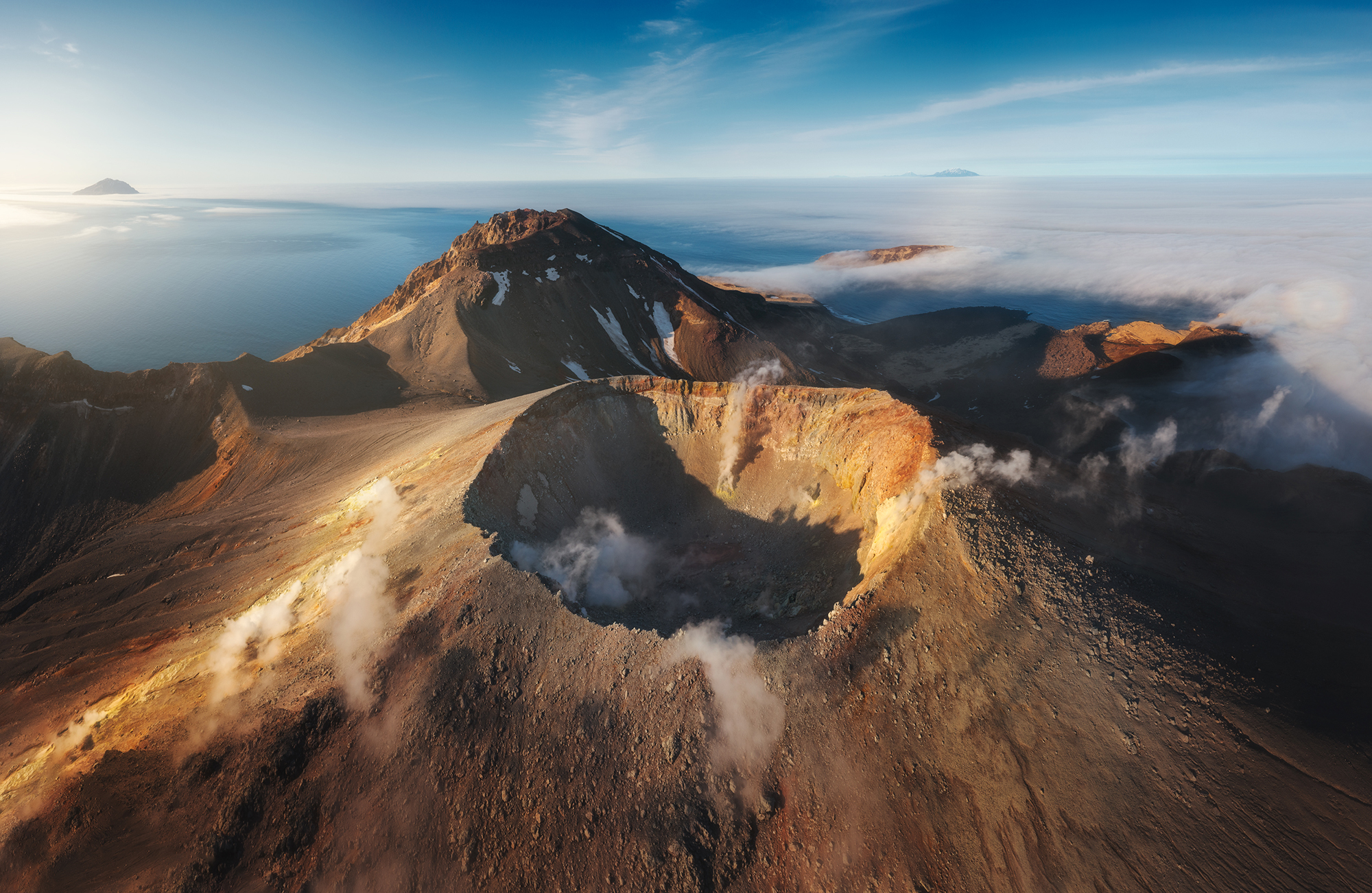 Но Такетоми - не единственная интересная точка на острове Атласова. Другая наша съемочная локация - Олимпийский прорыв. Конус извержения 1972 года с огромным лавовым потоком, который прорвался к океану и сформировал целый новый мыс. Если повезет со светом, то с вершины Олимпийского прорыва открывается впечатляющий вид на вулкан Алаид.