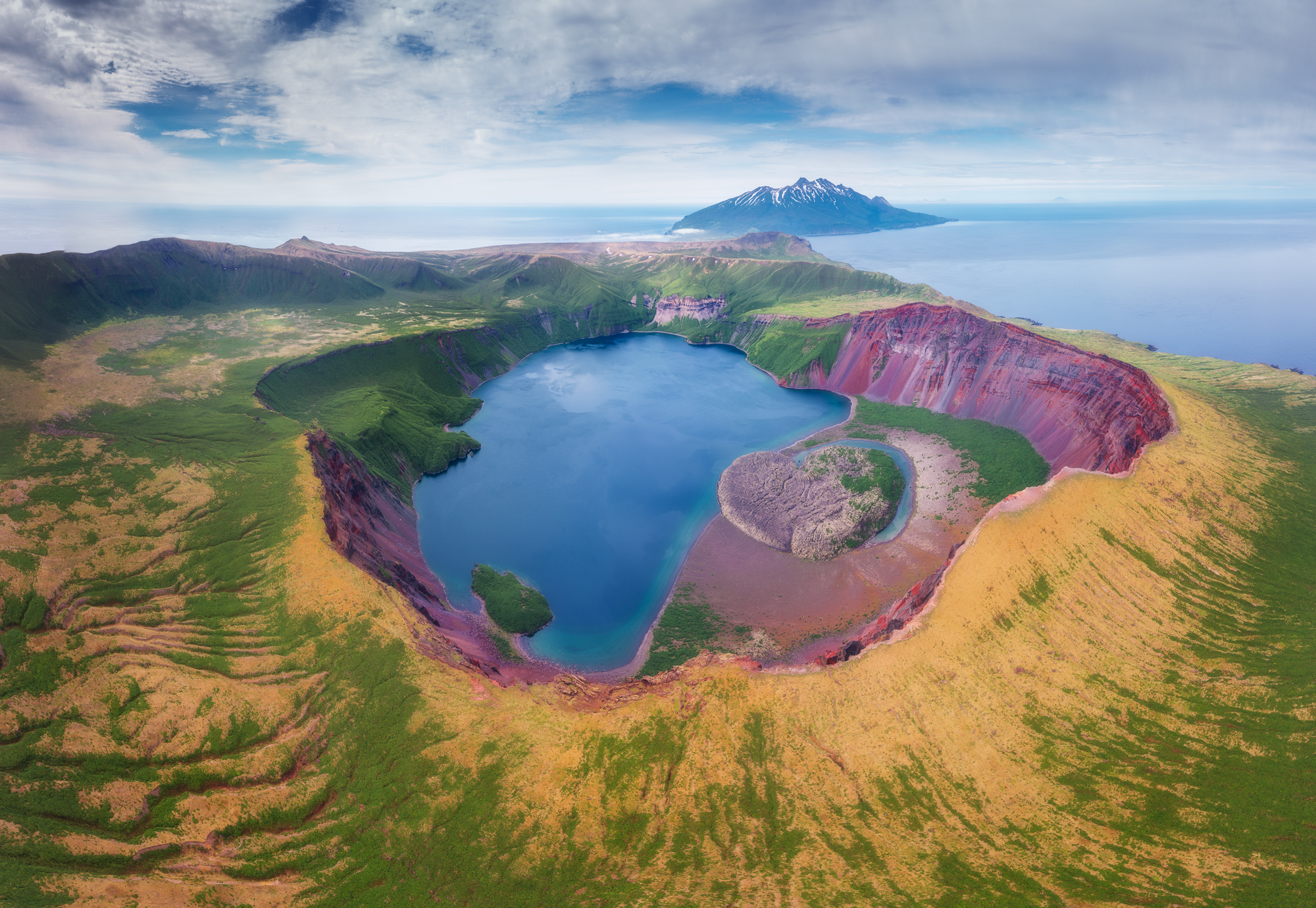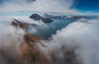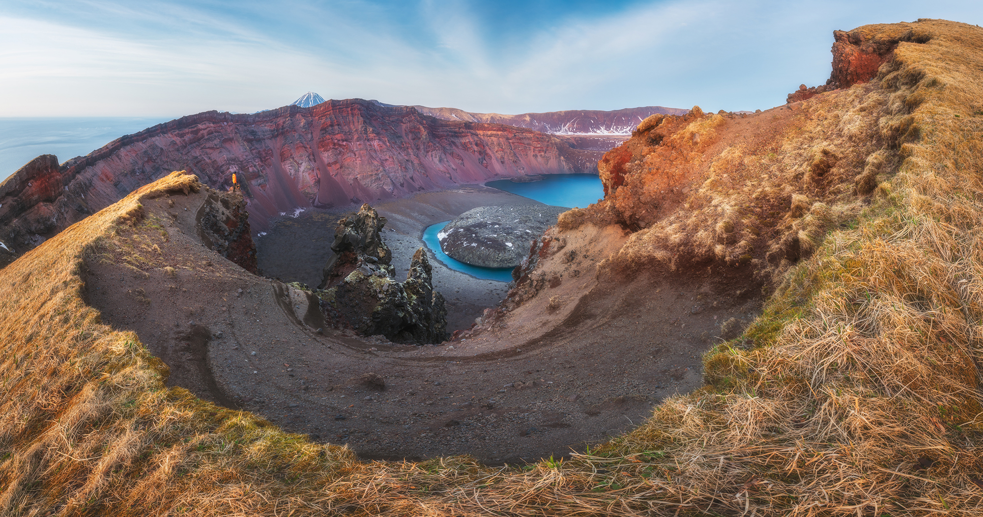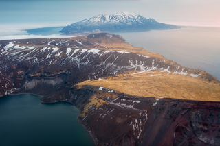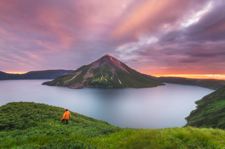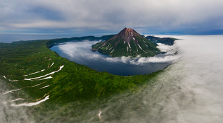 Взрыв древнего вулкана сформировал огромное озеро диаметром в 7 километров с обрывистыми краями. И, как неприступный замок, в центре этого озера возвышается вулкан Креницына.