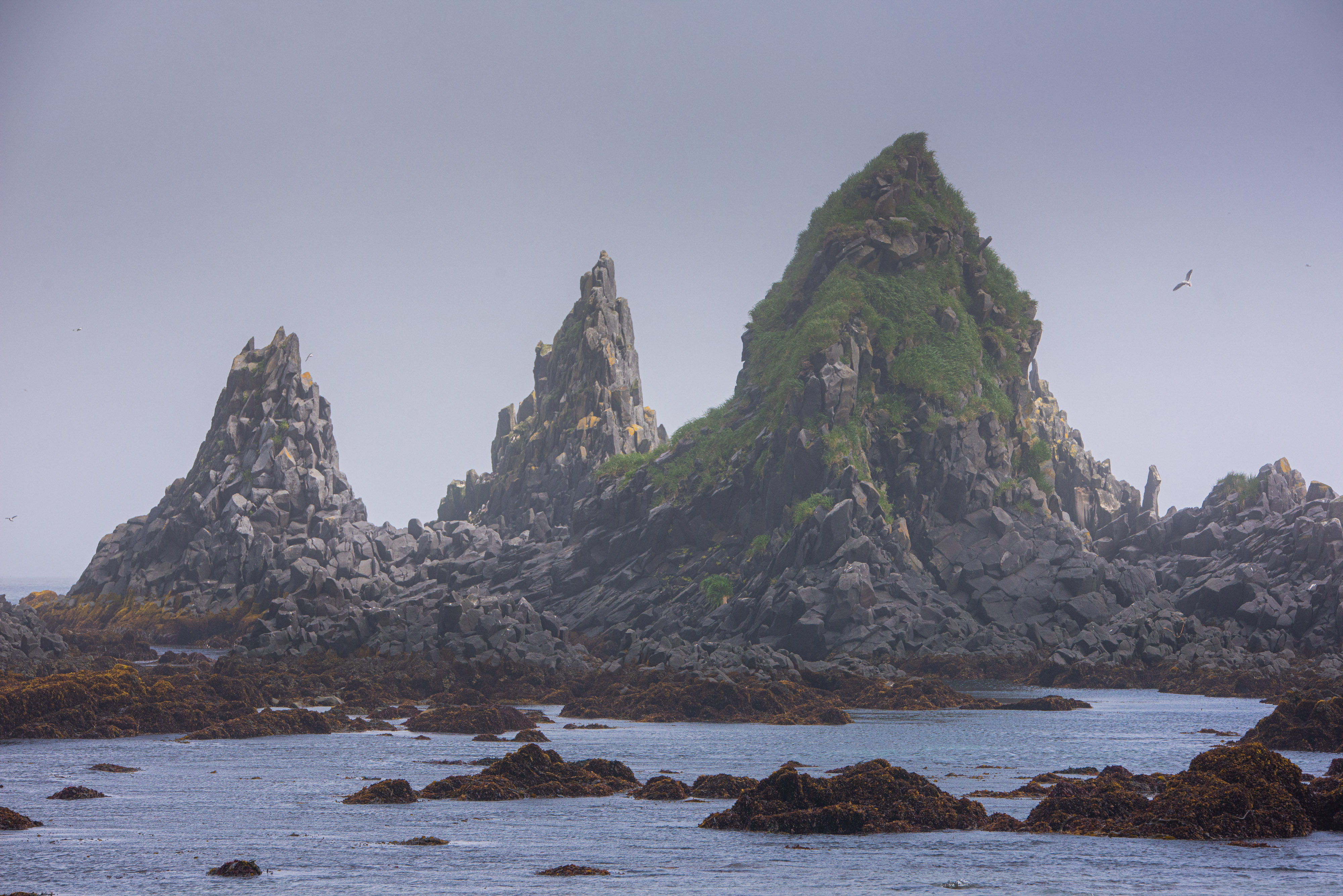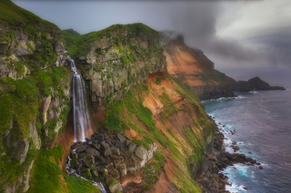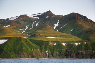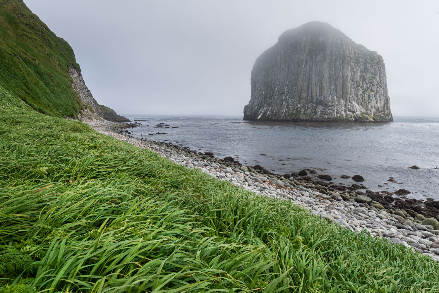 Довольно большой остров с живописными скальными столбами - кекурами, красивой береговой линией и водопадами, которые срываются с отвесных стен.