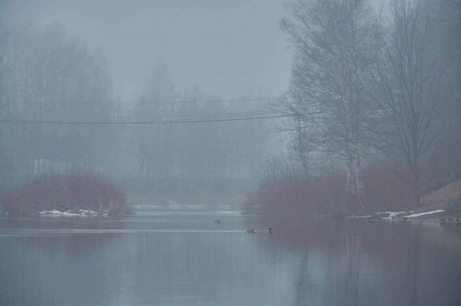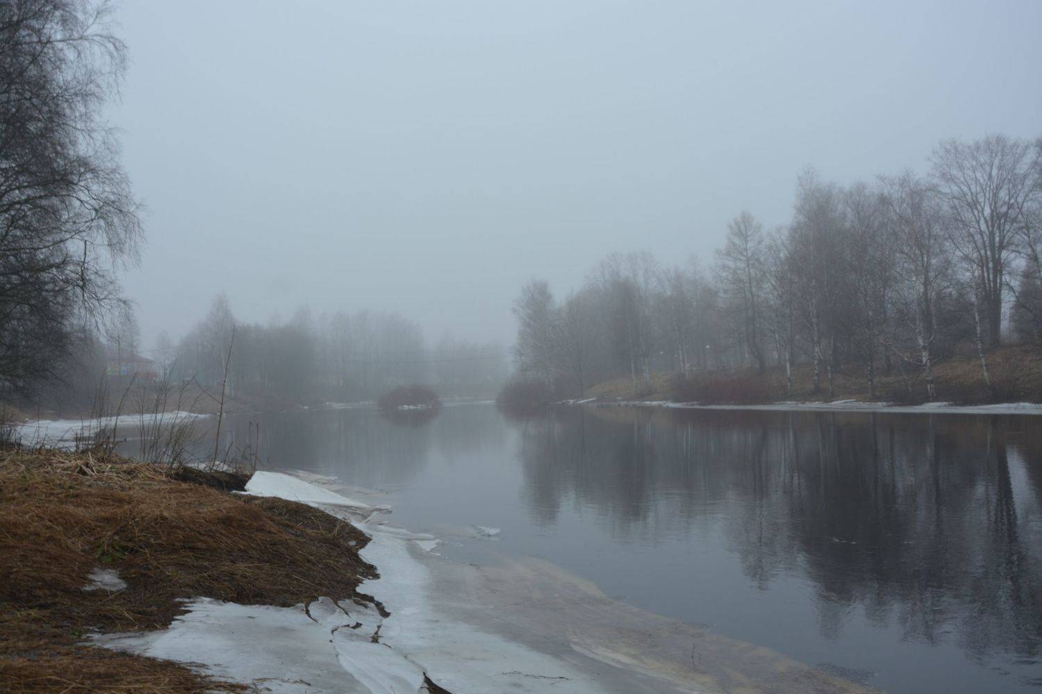 река Мегрега в тумане, Олонец, Россия, март месяц