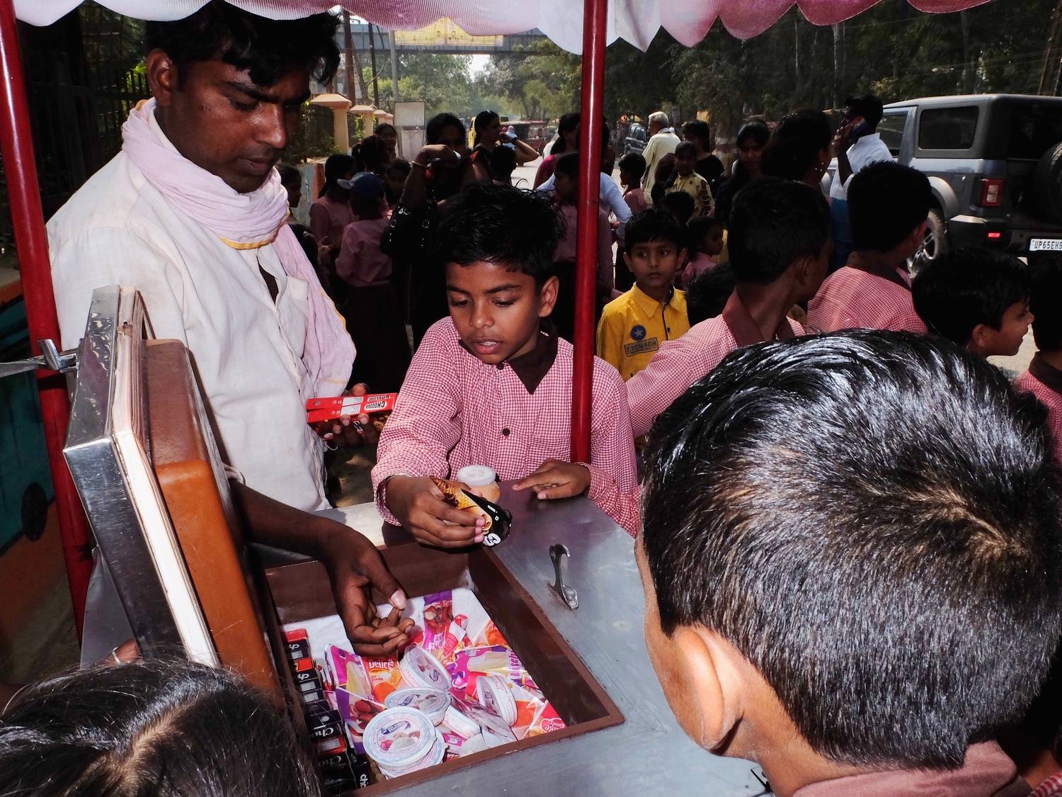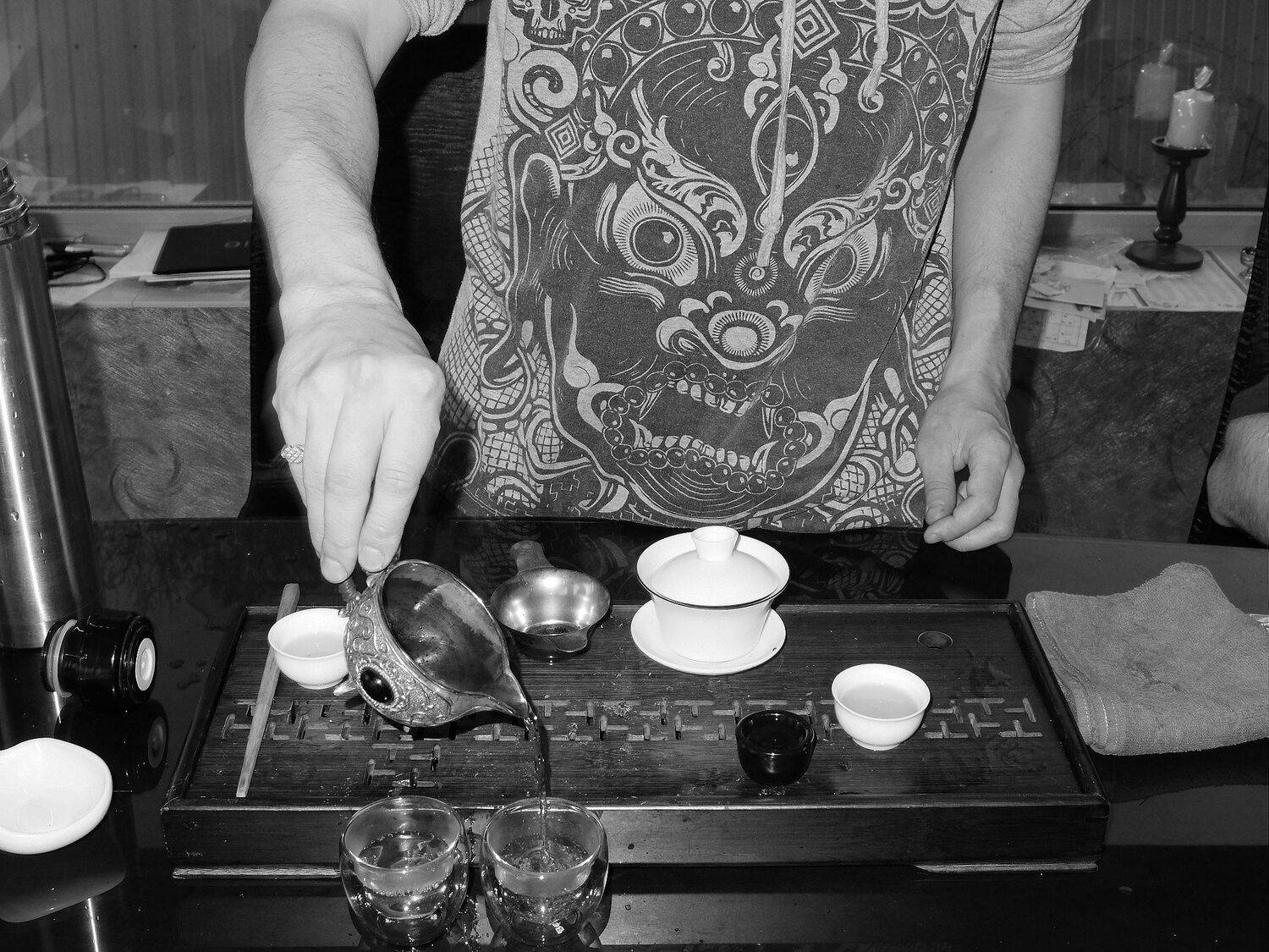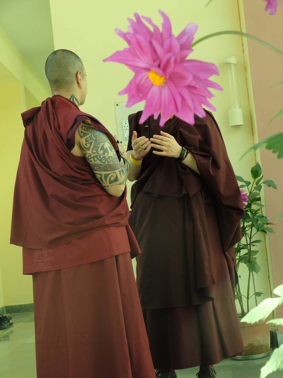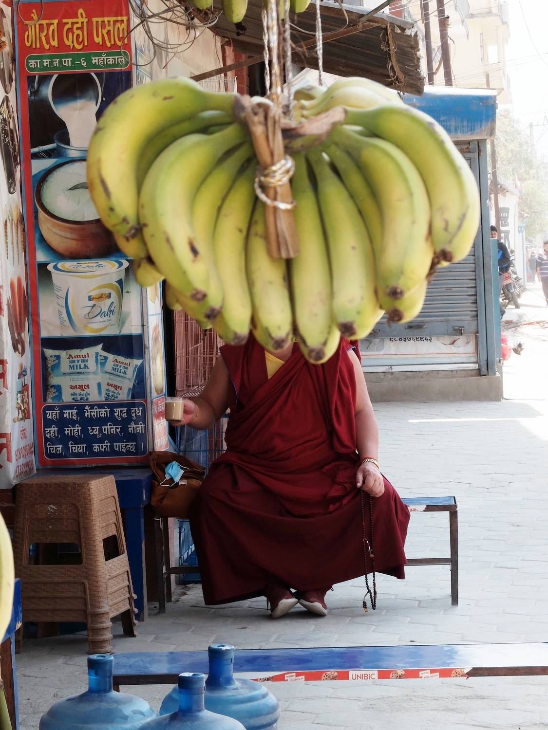 Монах пьет чай.Бананы ждут своего покупателя.