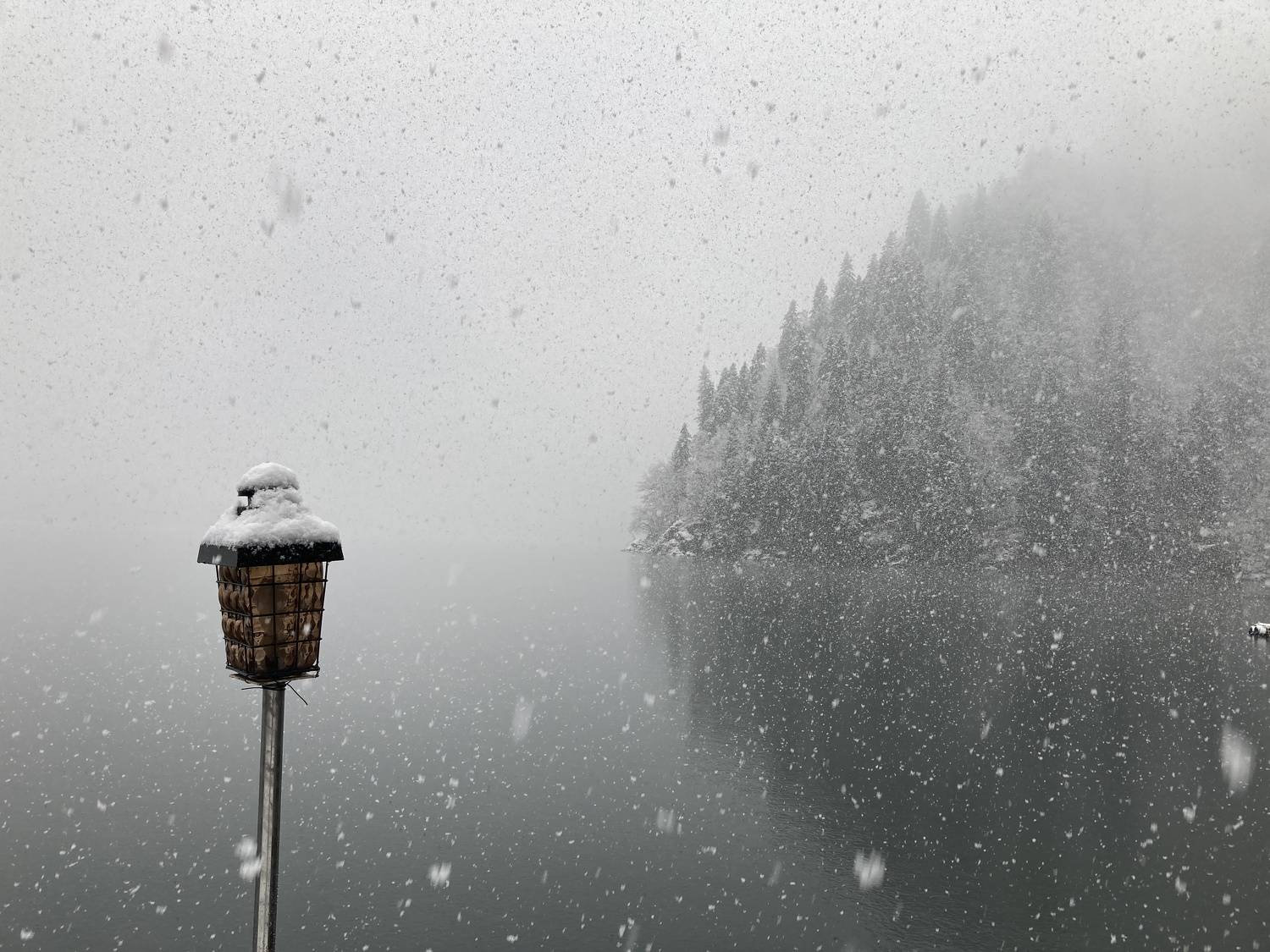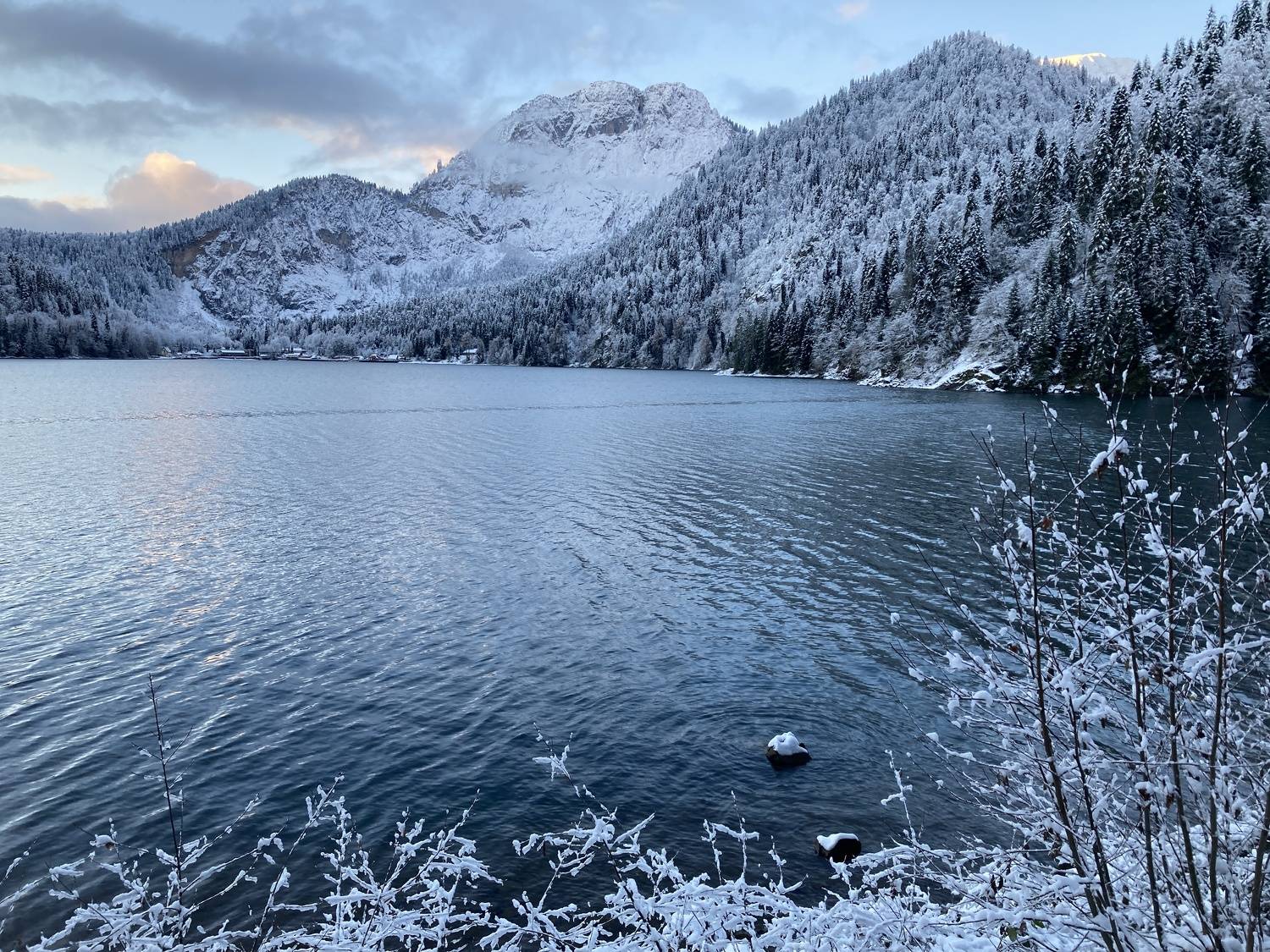 Снегопад на озере Рица
