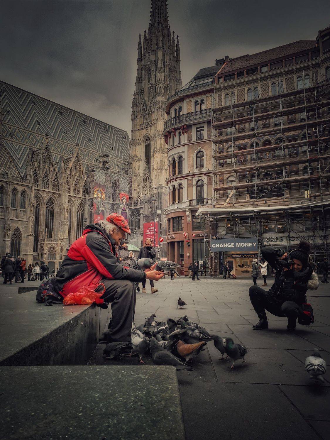 Одинокий мужчина кормит голубей