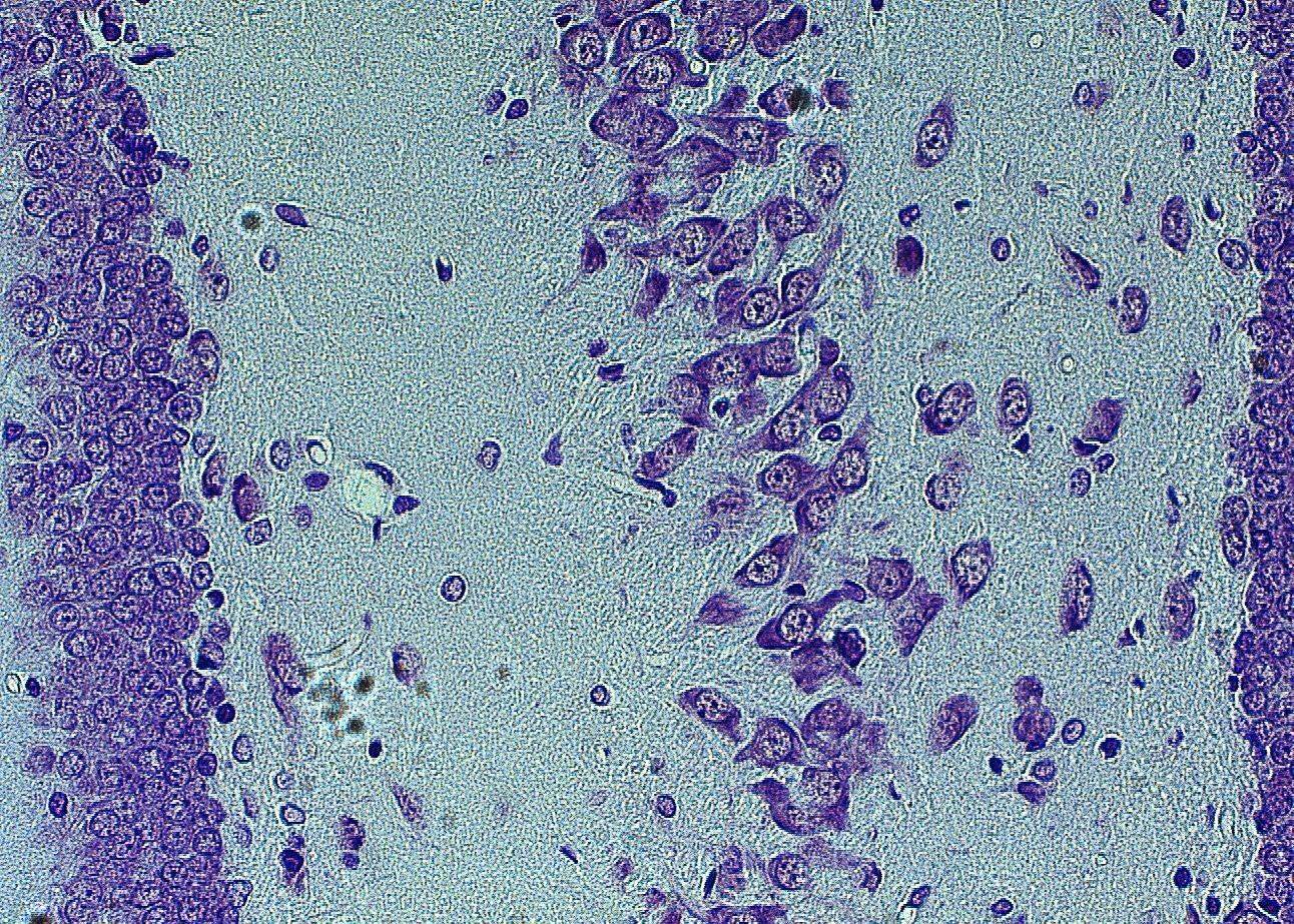 Пирамидные нейроны поля СА4 гиппокампа (справа) и гранулярные нейроны зубчатой фасции гиппокампа (слева)