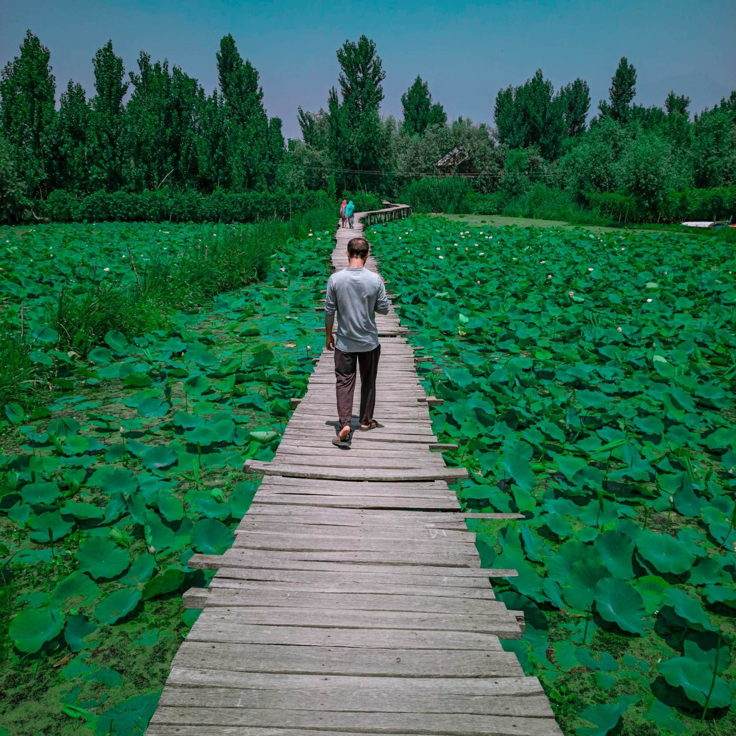 Men walking on wooden bridge
