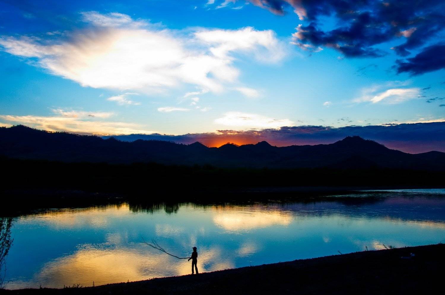 Одинокий рыбак в зареве заката.