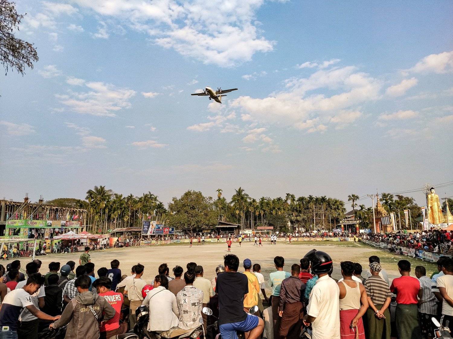 Landing Aeroplane Over a Football Match