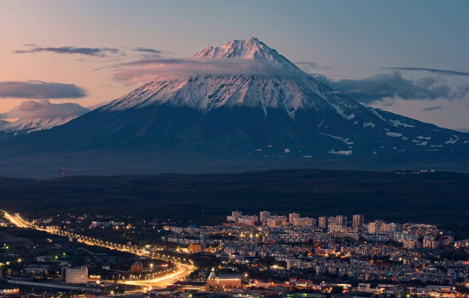 Петропавловск-Камчатский на фоне Корякского вулкана.