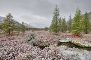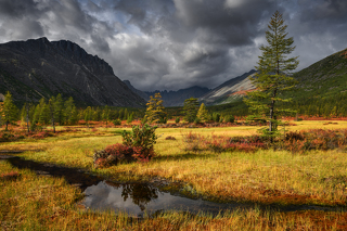 Переправа через р. Дебин. Переезд к озеру Джека Лондона на вахтовой машине. Ехать около пяти часов. Переправляемся на лодке к устью р.Пурга. Разбиваем палаточный лагерь. Ужин. Знакомство с окрестностями и вечерняя съемка.