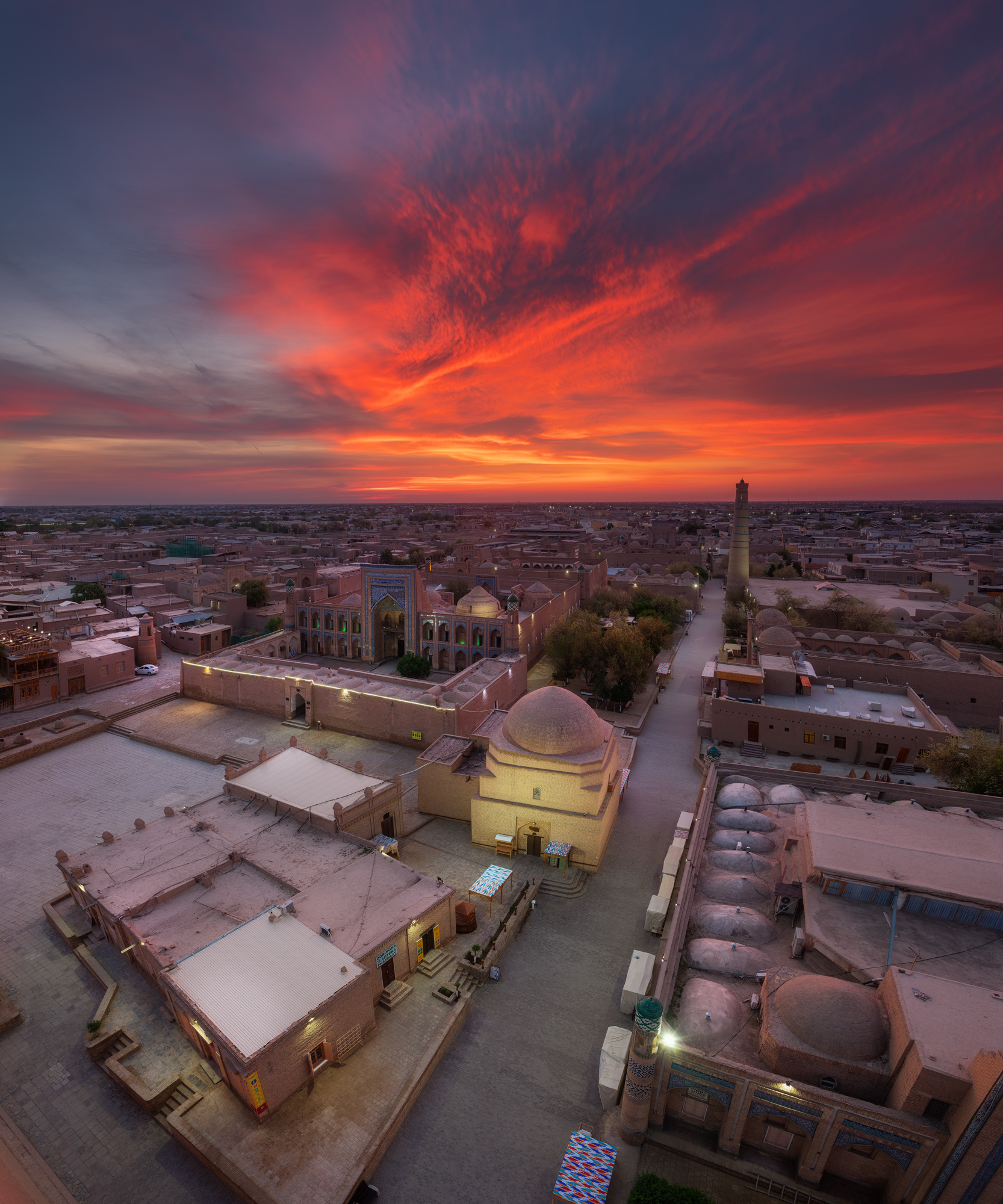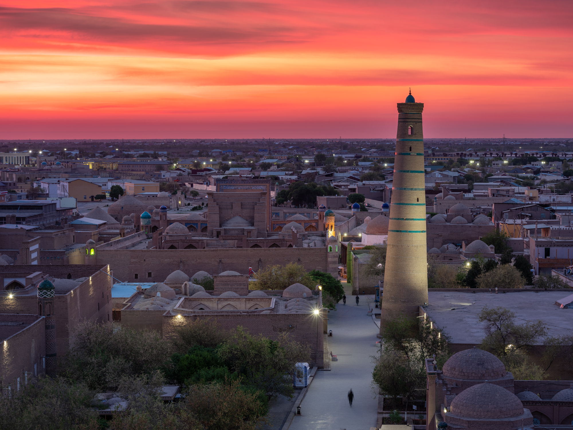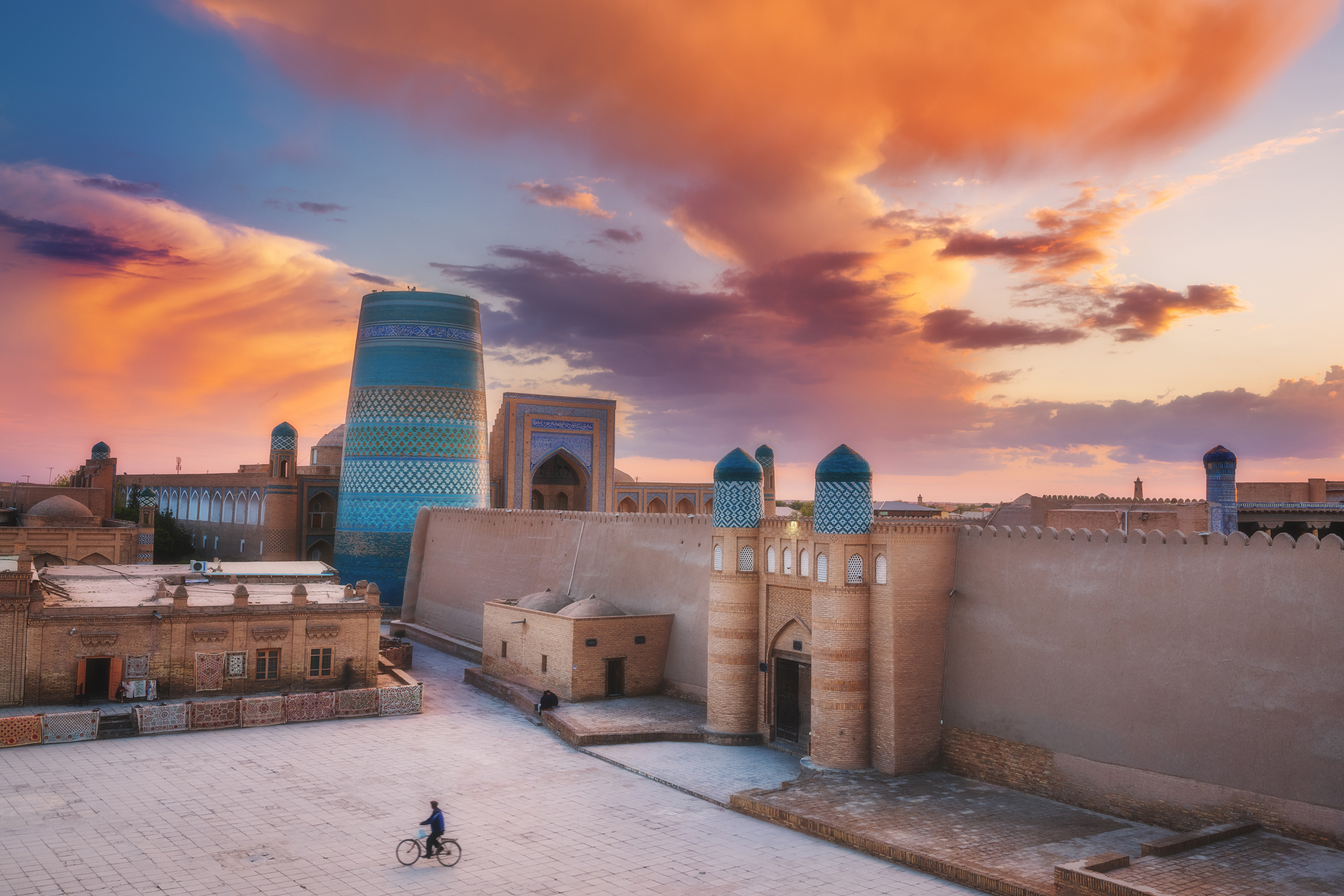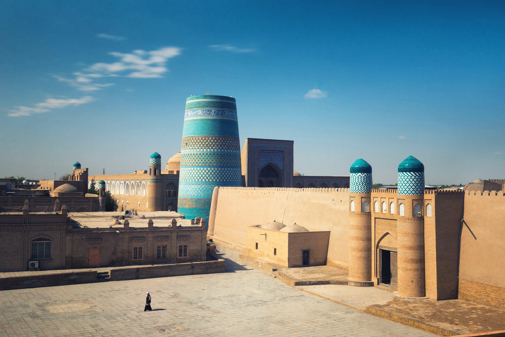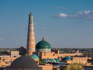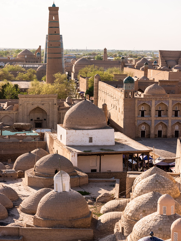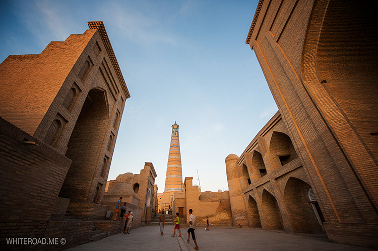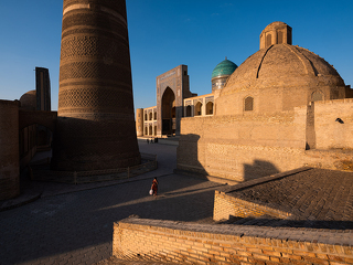 Утром, еще до завтрака, мы выйдем на полупустые улочки Хивы, чтобы побродить по городу, который только начинает пробуждаться ото сна. Старушки с метлами, торговцы неспешно открывают свои сувенирные лавочки, дети выбегают во дворы домов с веселым писком, ремесленники после короткой молитвы начинают свою тонкую работу. Ближе к восьми, когда откроются музеи, мы зайдем на минарет Ислам Ходжа и минарет Джума-Мечети, чтобы посмотреть на город с высоты птичьего полета.
