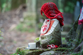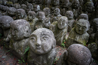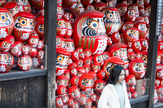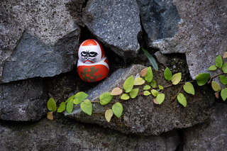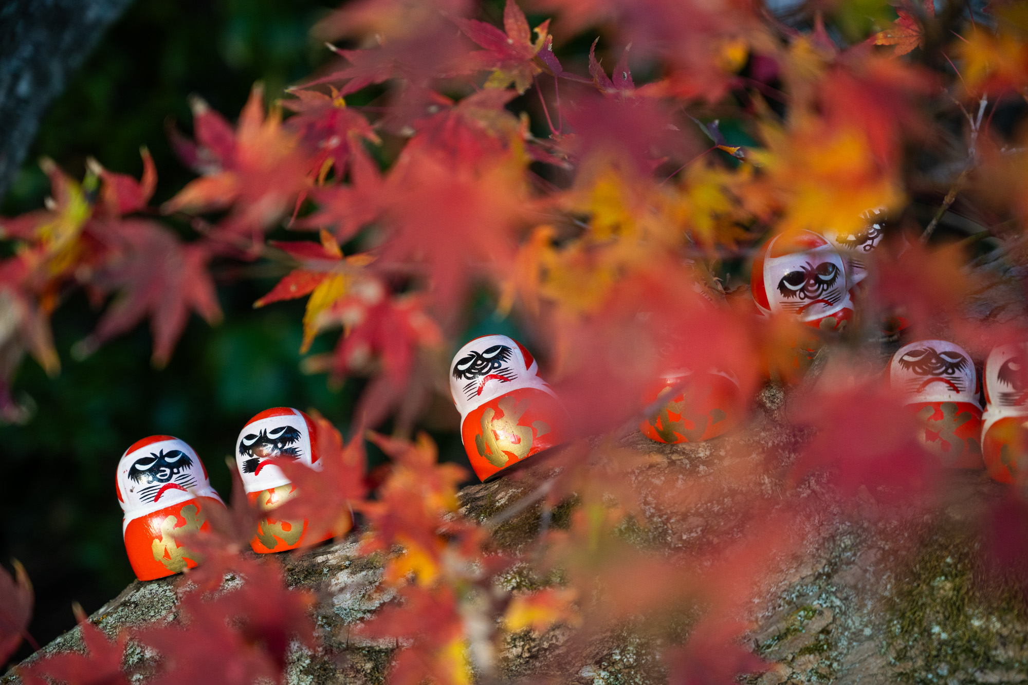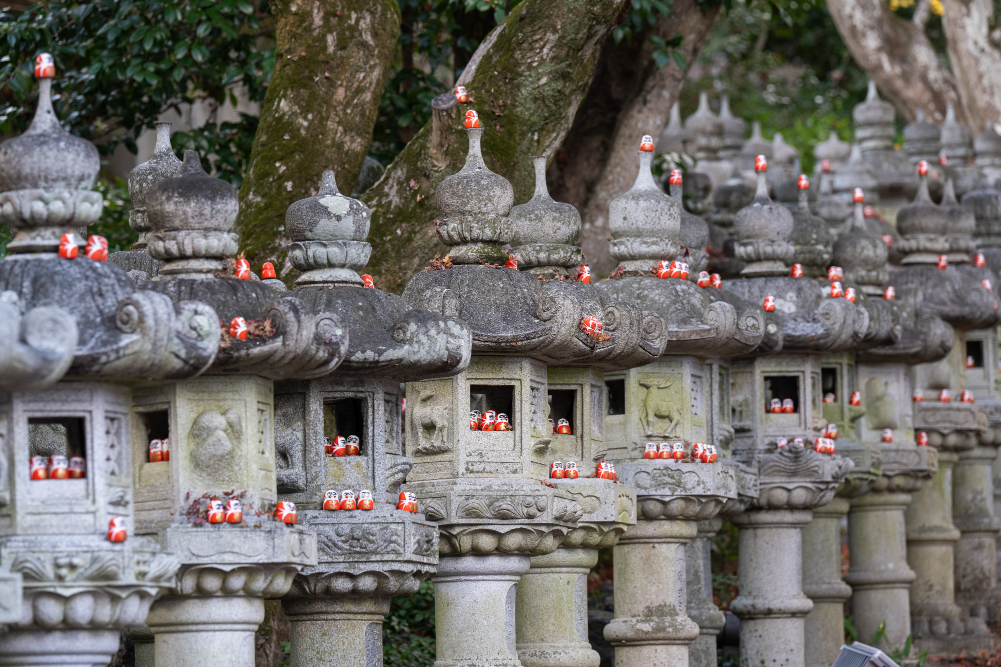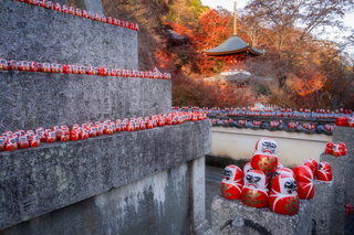 Даруму часто изображают в виде круглой куклы-неваляшки с выпученными глазами. Так вот, они в этом храме повсюду! То есть вы можете не просто поснимать красивые парковые пейзажи на территории храма (кстати, очень немаленькой), но и необычные сюжеты с кучей маленьких дарум, которые стоят в кустах, на камнях, каменных фонарях - да везде!