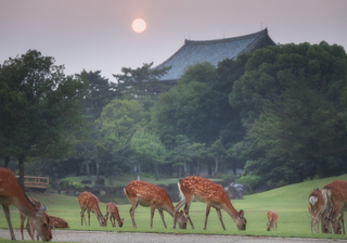 Наш отель находится в пешей доступности от знаменитого парка Нара - огромного заросшего лесом пространства, в котором ходят сотни оленей. Точнее, 1300. И все они не боятся людей, подпускают близко и охотно позируют. А если купить специальные печеньки, будут даже есть с рук.