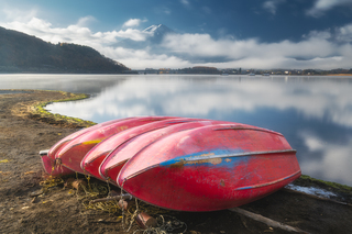 Сегодняшнее утро мы проведем на озере Фудзикавагутико. На берегу озера можно найти аккуратно разложенные лодочки, рядом высажено множество алых кленов.