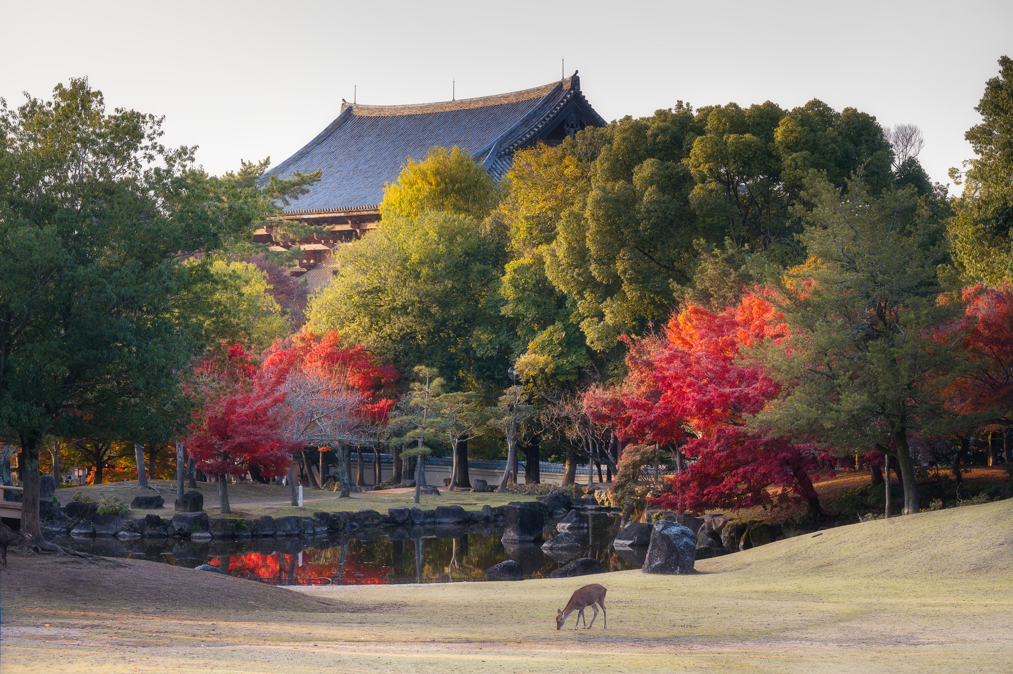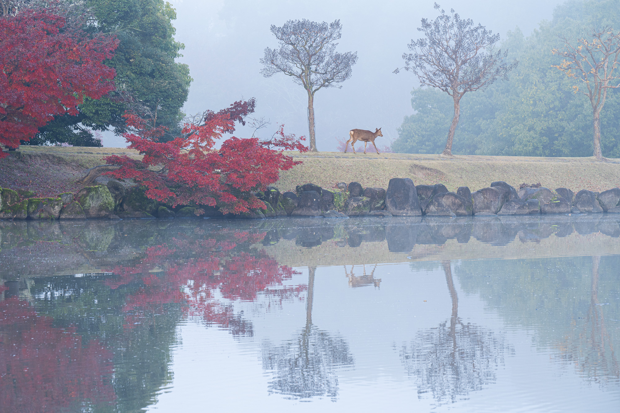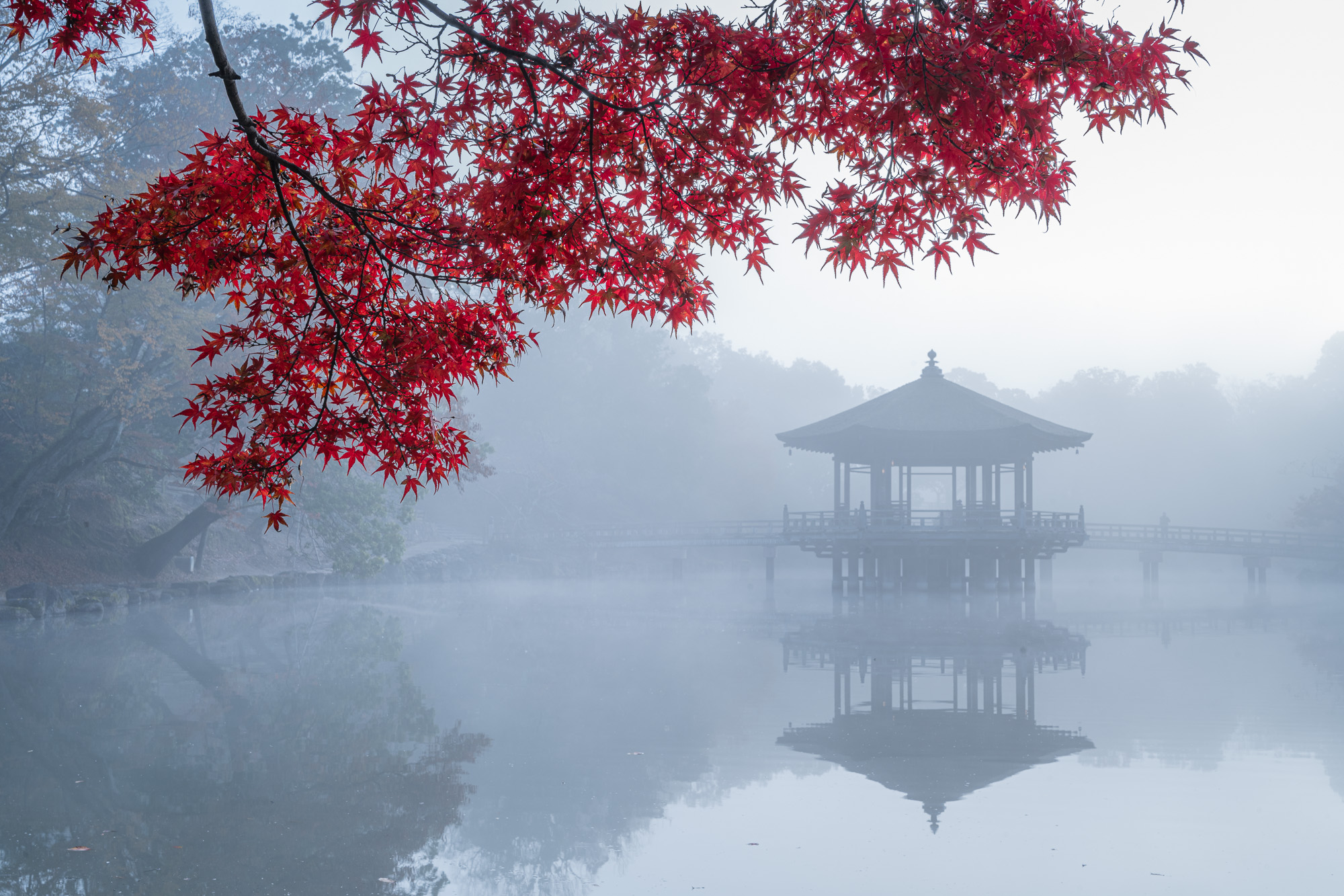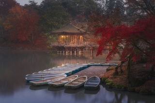 На рассвете мы снова пойдем снимать парк Нара. Наша локация - небольшой павильон Укимидо - беседка на воде, в которой ведет мост. На берегу достаточно алых кленов для переднего плана, а после заката над озером часто поднимается густой туман, которые позволяет получить сказочные кадры.