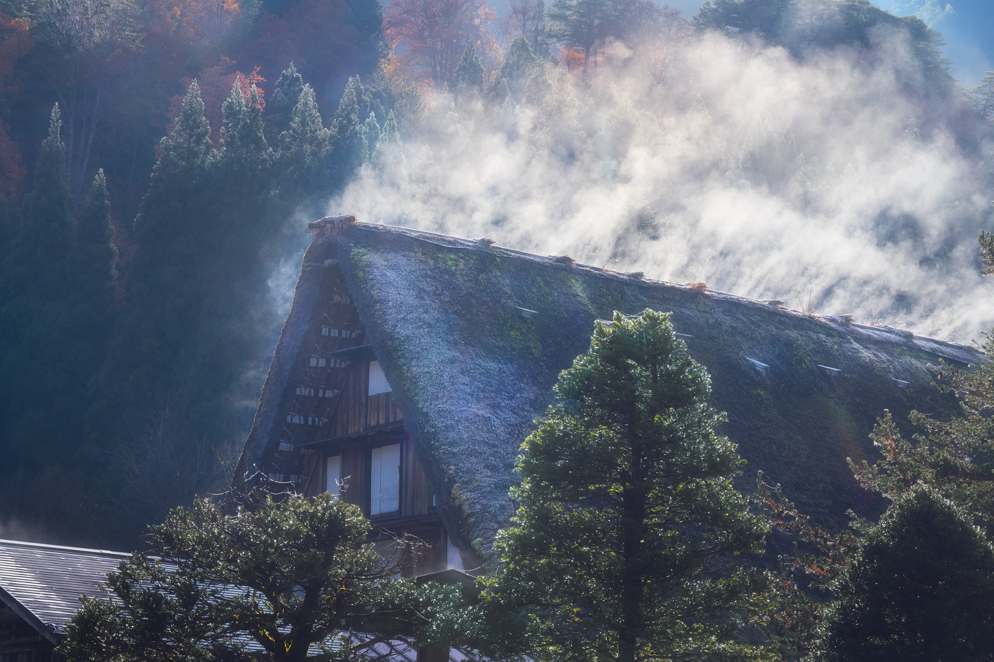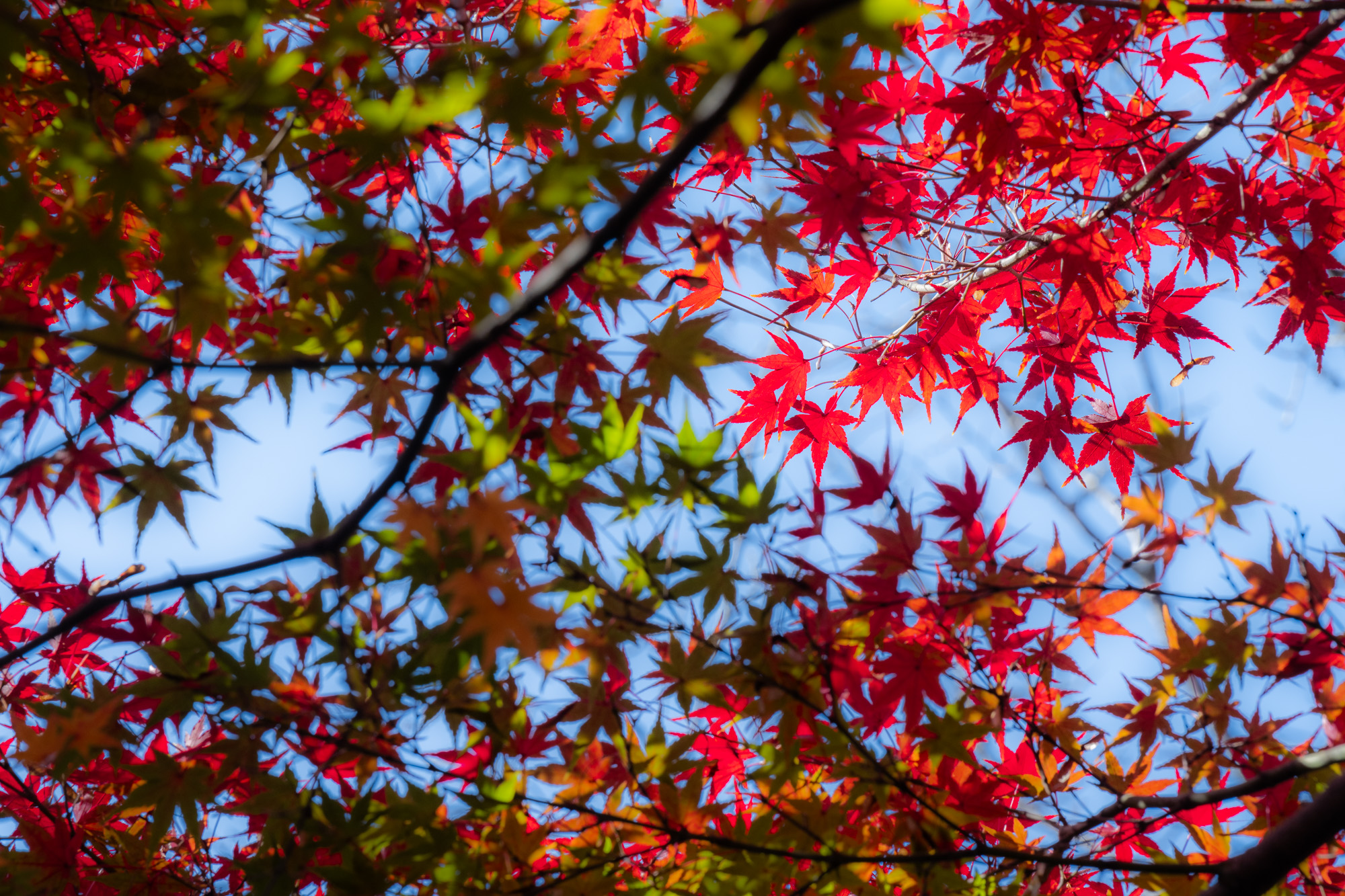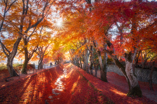 А совсем рядом с нашей точкой съемки находится очень красивая локация - тоннель момидзи. Это довольно глубокий канал, по берегам которого высажены кленовые деревья. Осенью это место окрашивается от алого до оранжевого от листьев момидзи, а утренний свет зажигает краски еще ярче.