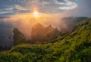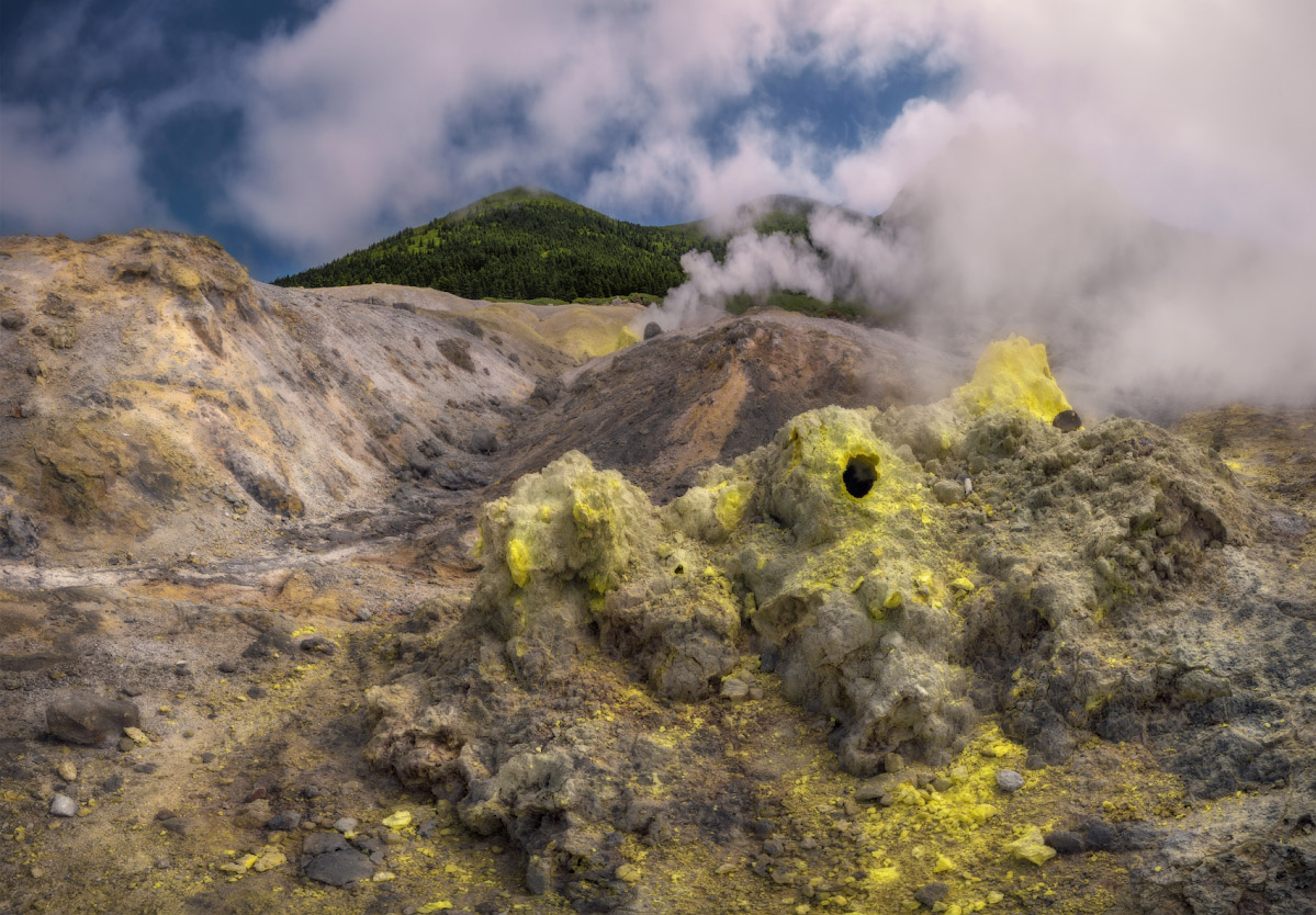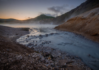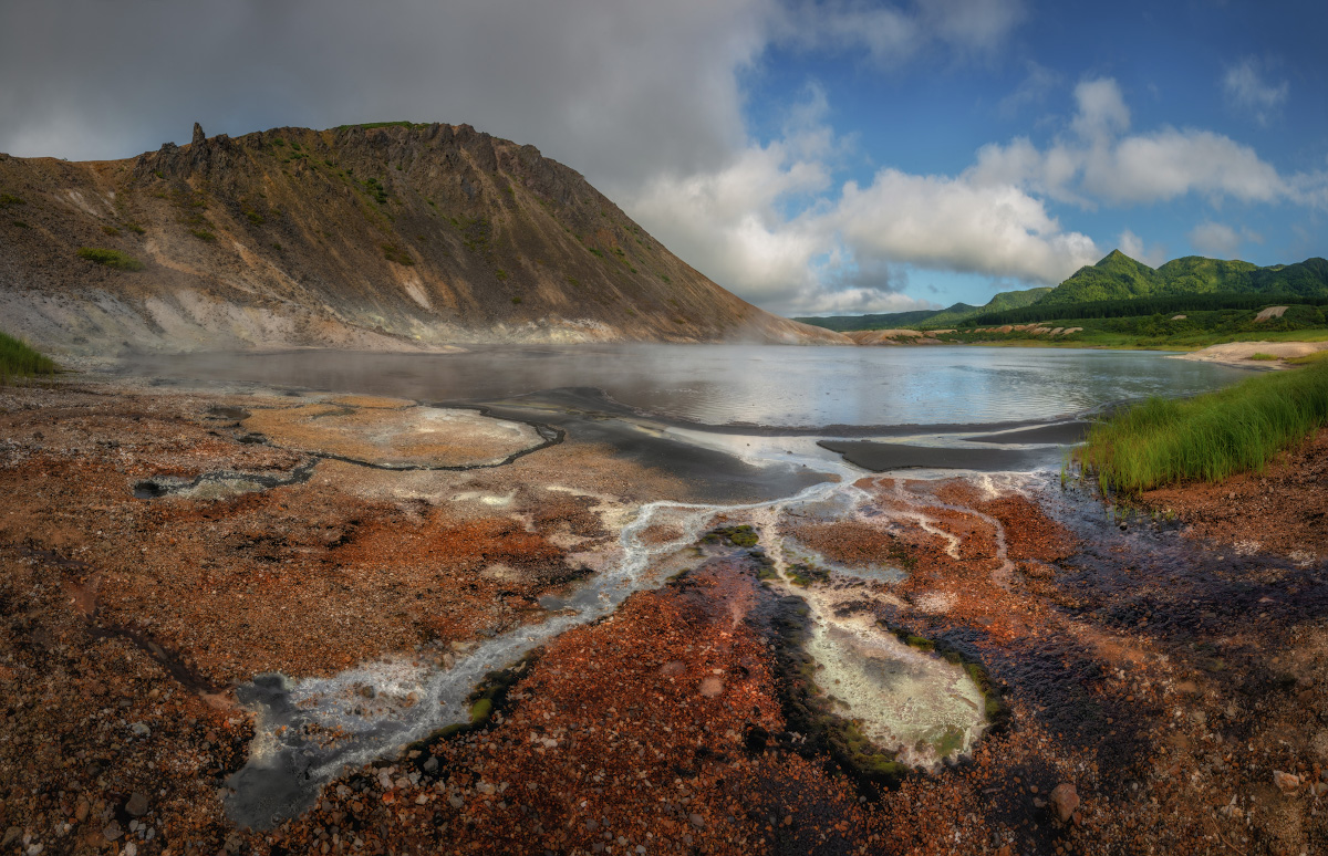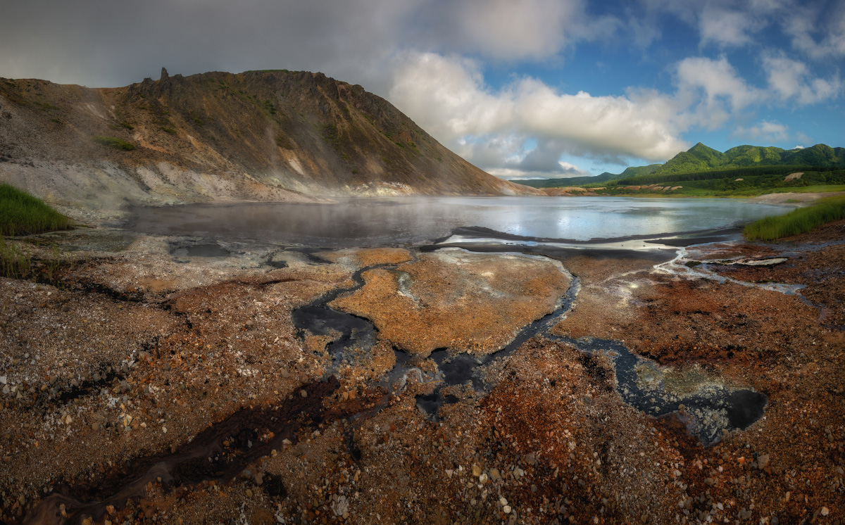 Утренняя или дневная съемка Головнинского клифа, если позволяет уровень отлива. Запасной вариант - утренняя съемка побережья в районе озера Лагунное. Выезд к кальдере вулкана Головнина. Трекинг к озеру Горячее. Вечерняя съемка озера Кипящее и окрестностей. Возвращение в гостиницу Южно-Курильска.