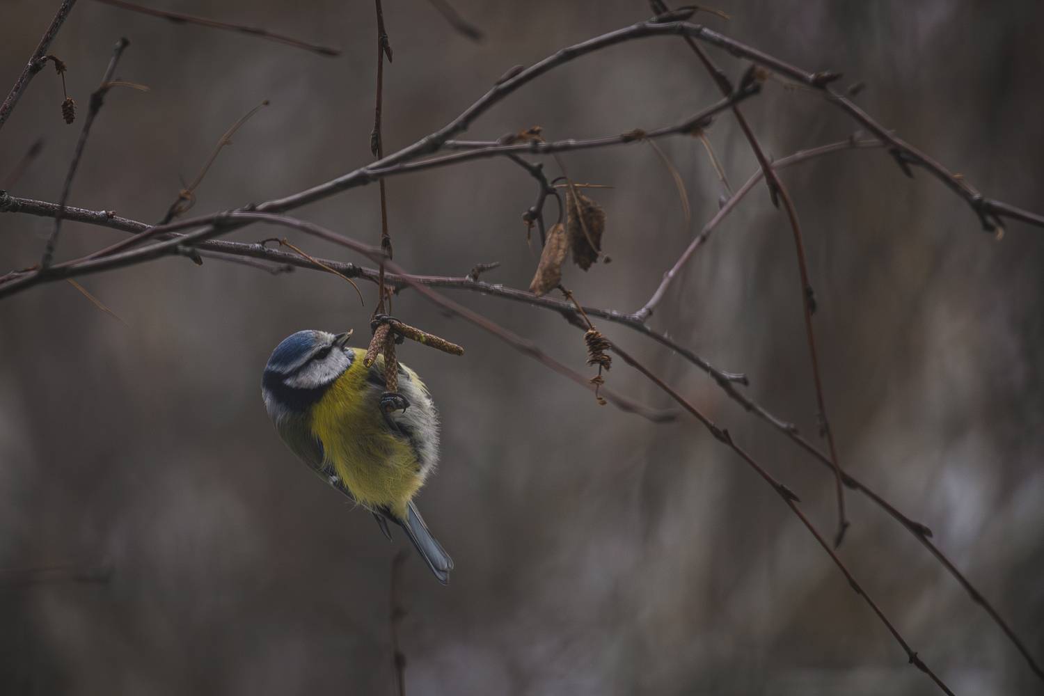 Синица лакомится в мороз \"берёзовыми серёжками\"
