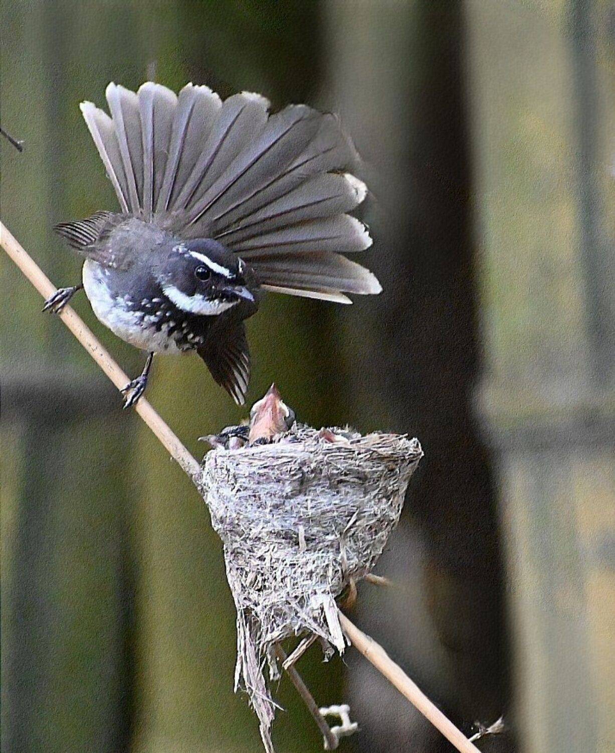 White throated fantail fly catcher looking at chicks after feeding
