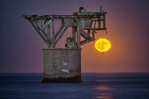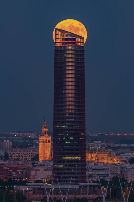 Salida de la luna llena de Septiembre de 2024, alineada con la Sagrada Familia y la Torre Glories. La foto está hecha a 2,8 km de distancia de la Sagrada Familia y a 4 km de la Torre Glories.