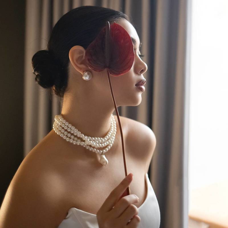 The background is soft and features floral branches that harmonize with her attire, while the predominant colors are neutral tones, whites, and beiges, giving a sense of calm and sophistication. The soft lighting enhances her facial features, and the overall atmosphere seems inspired by a romantic and classical style, as if it were part of an artistic portrait.