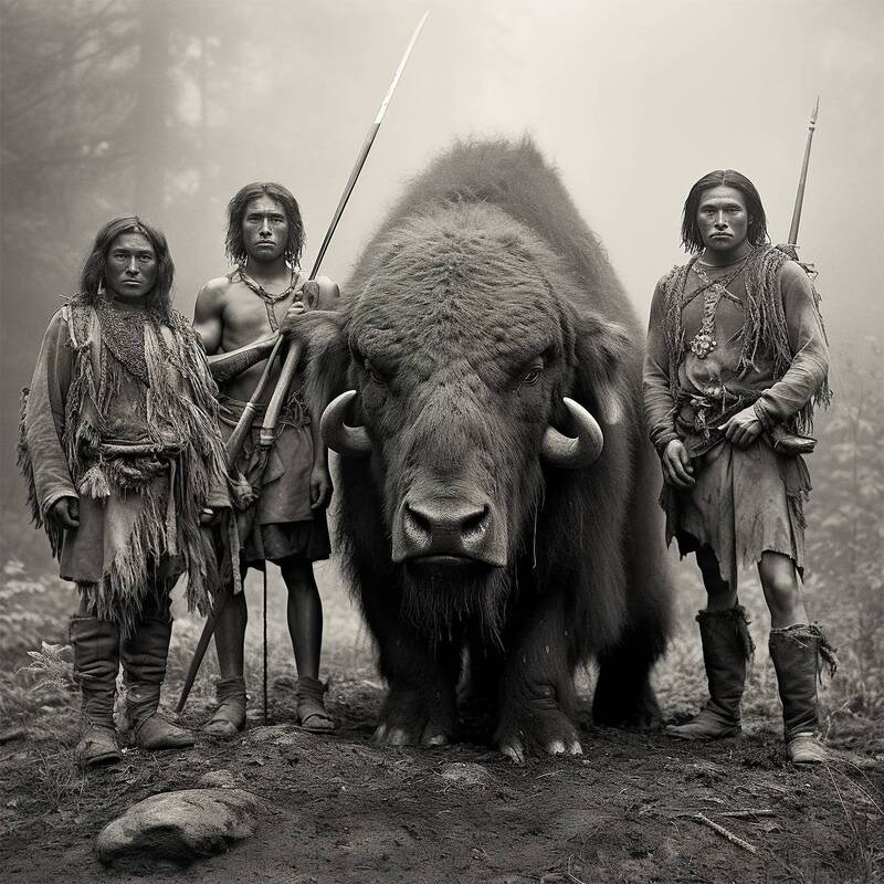 Un bisonte americano emerge de las sombras con una mirada penetrante que refleja la fuerza y la resistencia de su especie. La composición en blanco y negro resalta cada detalle de su espeso pelaje y la textura de sus cuernos, creando una imagen poderosa e hipnótica. Una representación pura de la naturaleza indomable y la esencia del salvajismo.