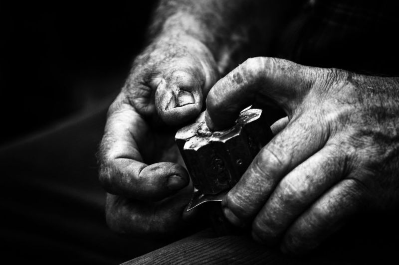 The oud maker Sami Afifi works at his workshop located at street level in Downtown Cairo. He is considered one of the most skilled oud manufacturers in Egypt whose craft comes from a family tradition of over 100 years. While visiting him, he was kind enough to let me photograph him as he was working assembling the resonance box and the soundboard. The street was recently cleaned, a puddle of water in front of the workshop caught his reflection creating an aesthetic atmosphere of a singular craftsman at work.