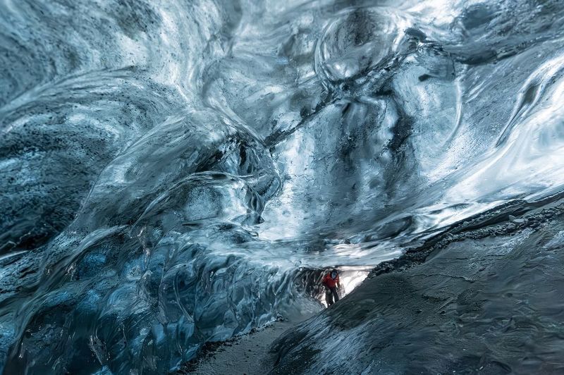 На этой фотографии запечатлён волшебный момент, когда ледяная природа раскрывает свои секреты. Вход в ледяную пещеру, уходящий в расфокус на заднем плане, символизирует неизведанность и тайну. Но главное внимание приковывает передний план: крупный план льда, пронизанного светом. Текстуры льда, словно отпечатки времени, рассказывают о тысячелетней истории, запертых в его толщах. Сквозь эти природные слои свет просачивается мягко, как напоминание о том, что даже в самых холодных и неприступных местах природа дарит моменты удивительной красоты и тепла.