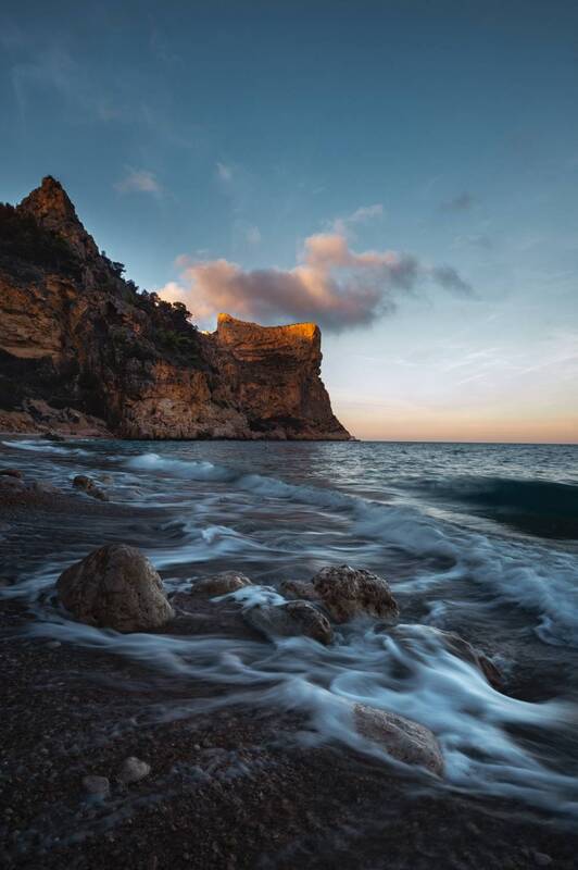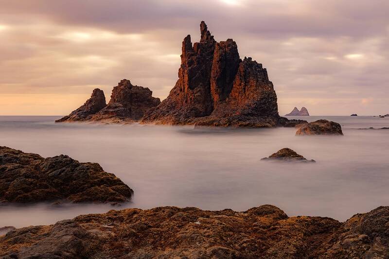 When I arrived, I noticed that the sea had just the right amount of energy to finally attempt a shot I had been envisioning for months. Until now, the conditions had never aligned, but yesterday was the day. The water moved perfectly, creating those silky textures I had in mind, and to our surprise, the sky put on a show just as the sun was about to set.