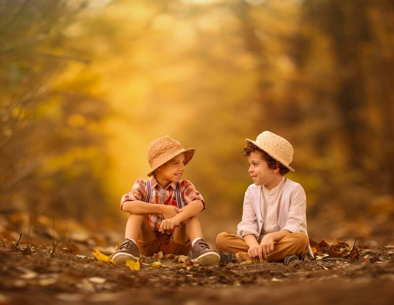 En un cálido escenario otoñal, una niña pequeña se agacha con ternura, dejando que las hojas caídas bailen entre sus manos. Los tonos marrones envolventes reflejan la quietud y la magia de la estación, mientras ella se sumerge en el juego simple y efímero de la naturaleza.